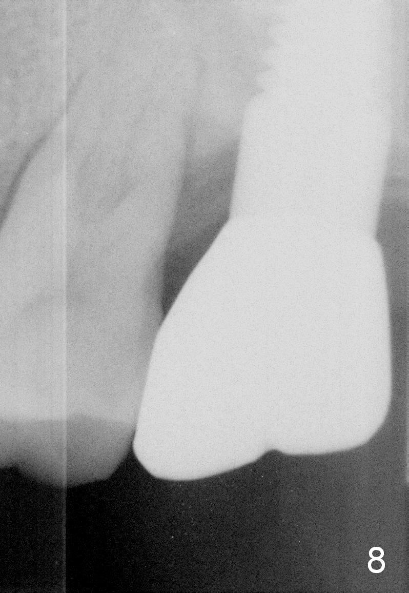 The vertigo does disappear pretty soon. The patient is pleased with the implant. PAs are taken 7 months (Fig.5,6 arrowheads: sinus floor) and 1 year 7 months (Fig.7,8) post cementation. The tooth #14 has furcation infection (Fig.8). Back to Professionals Follow up Xin Wei, DDS, PhD, MS 1st edition 01/29/2013, last revision 08/11/2019