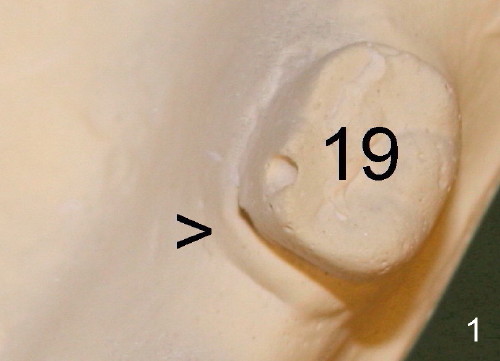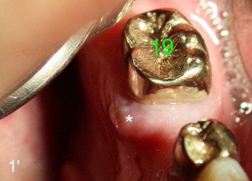 At the time of impression and design, there is no gingival swelling around the tooth #19 (Fig.1: >). This is not the case (Fig.1': *) at the appointment of implant placement on the other side (#30). Return the main text
