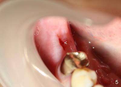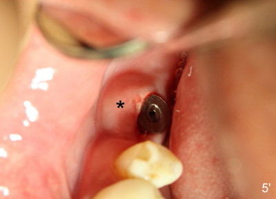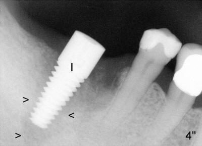 In case that there is an oral infection, submerged implant (Fig.4: I; Bicon 5x8; white line indicates gingival margin) may reduce the chance of pathogen contamination postoperatively. Fig.5 shows slight wound gaping after suture removal, one week postoperatively. In contrast, the implant in Fig.4' (Tatum 6x17) is non-submerged (white line indicates gingival margin). Two week post-operatively, an infection develops buccal to the implant (Fig.5'). Bone loses around the non-submerged implant 1 month after placement (Fig.4"). Finally the implant has to be removed. Return How to Avoid Post-implant Infection
