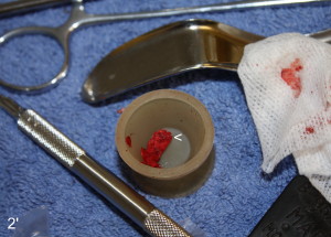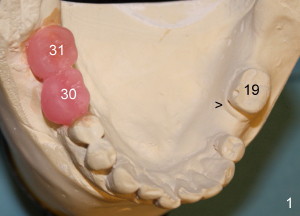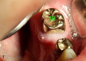 Mr. Lip returns to clinic for #30 and 31 implant placement. At the time of impression, there is no sign of gingival swelling around the tooth #19 (Fig.1: >; although the tooth has suspected root fracture). The patient requests keeping this affected tooth as long as possible while #30,31 implants are being placed and restored. This is not the case at the appointment of implant placement on the other side (Fig.1': *). There is localized gingival erythema and edema at the ML line angle. It appears that the treatment plan should be changed: the number of implants to be placed should be reduced from two to one and the infected tooth should be extracted to decrease the chance of implant infection. These two procedures are intended to be done at the same time so that bone harvested from #30 implant osteotomy (Fig.2) can be saved (Fig.2': < in dapen dish) and grafted in #19 sockets (Fig.3', 4'), particularly in the mesial one with severe bone loss due to root fracture.