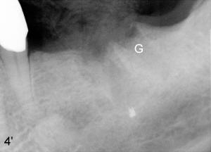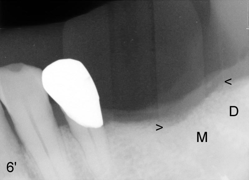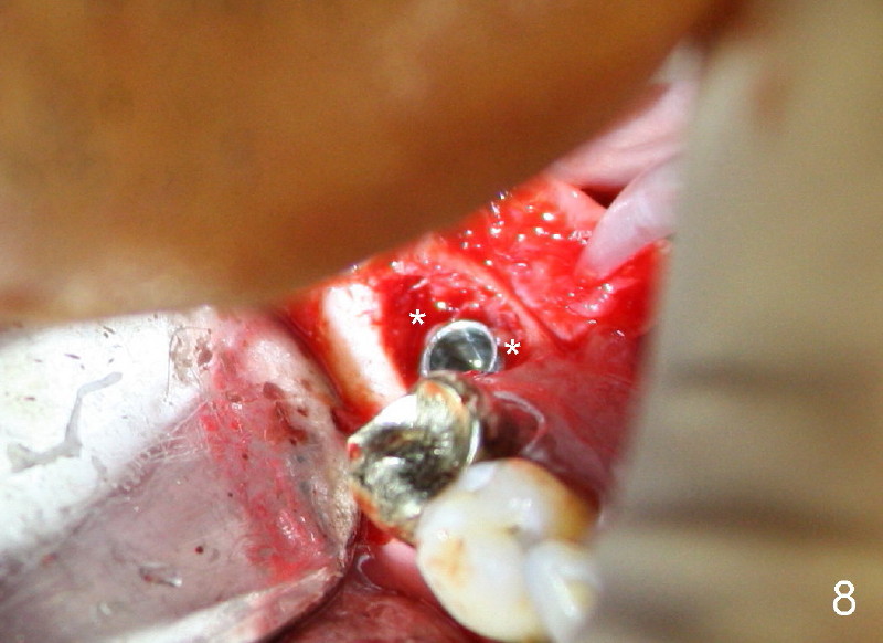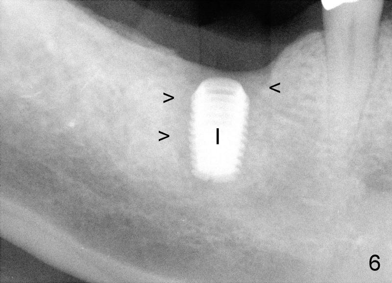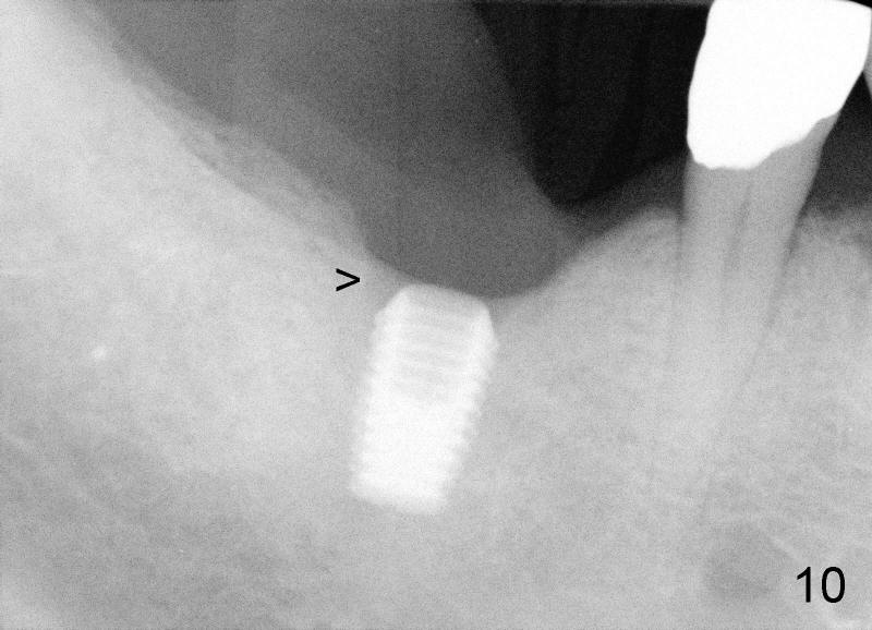 Three months later, the wound heals. X-ray shows that bone loss distal to the implant (Fig.6 double arrowheads) disappears, similar to the one taken another two months later (Fig.10), when the implant is uncovered. The circumferential bone loss shown in Fig.8 is reduced to the distal crest of the implant at the time of uncovering (data not shown).