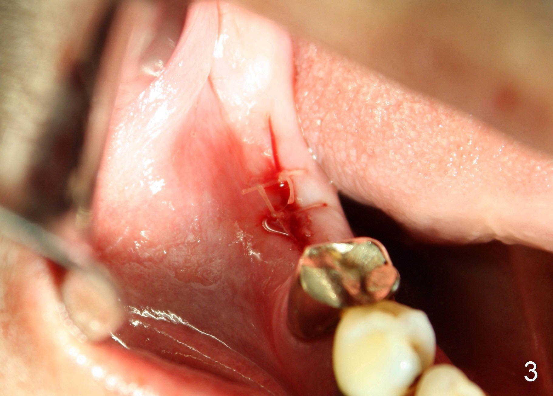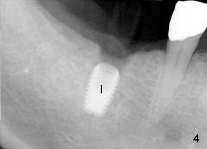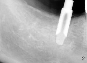 The second precaution to be taken to prevent post-implant infection is to place implant subgingival (submerged with suture to close the incision), instead of supragingival (Fig.3,4). Bicon 5x8 implant is used with bone expansion. The short implant also reduces chance of damage to the inferior alveolar nerve. Paresthesia and hyperethesia (pain) prevents the patient from keeping good oral hygiene post-operatively.