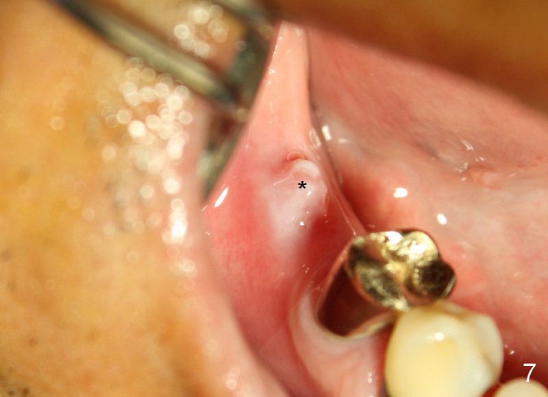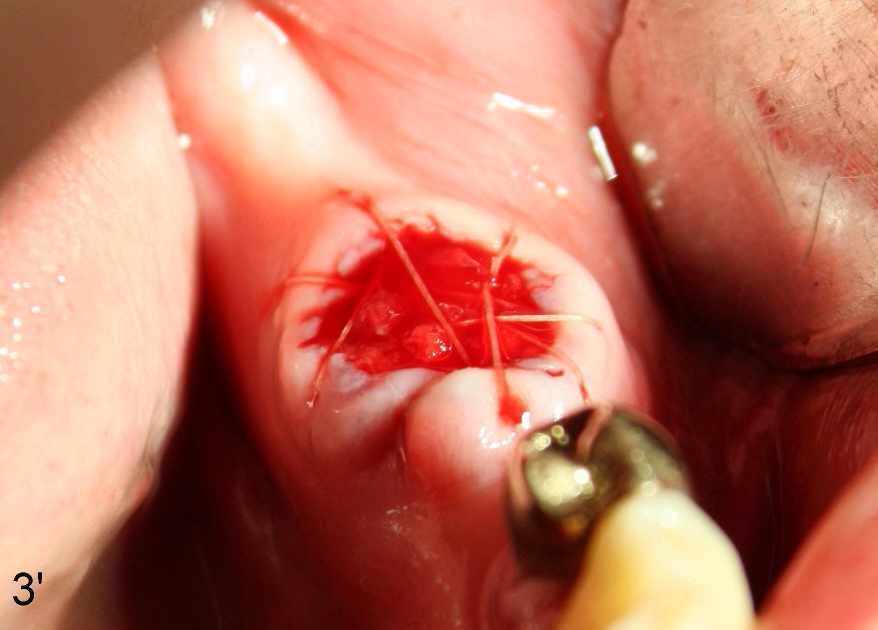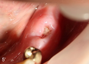 Postoperatively, there is minimal pain for Mr. Lip. The patient rinses with Chlorhexidine, although he does not take Amoxicillin. Luckily, there is no sign of infection either in #30 implant placement area (Fig.5, wound dehisces after suture removal), or in the extraction sockets (Fig.5'), one week postoperatively.