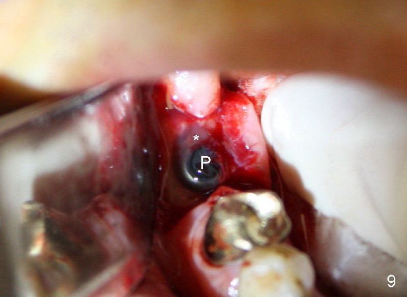 Unfortunately, there is bone resorption around the implant 3 months postop (Fig.6: >, as compared to Fig.4). Granulation tissue is present over the implant (Fig.7 *). The patient complains occasional pain and swelling after implant placement. Bone resorption is confirmed after removal of granulation tissue around the implant (Fig.8 *). After acid etch, Endogain (Fig.9 *, Straumann) is placed around the implant (P: healing plug). Flaps are approximated with 4-0 plain gut suture. Collagen membrane should have been used. Amoxicillin is prescribed, but the patient does not take it. It appears that bone graft to the sockets of #19 helps form an apparently continuous bone plate at the alveolar crest over the mesial (M in Fig.6') and distal (D) sockets, as compared to Fig.4'.