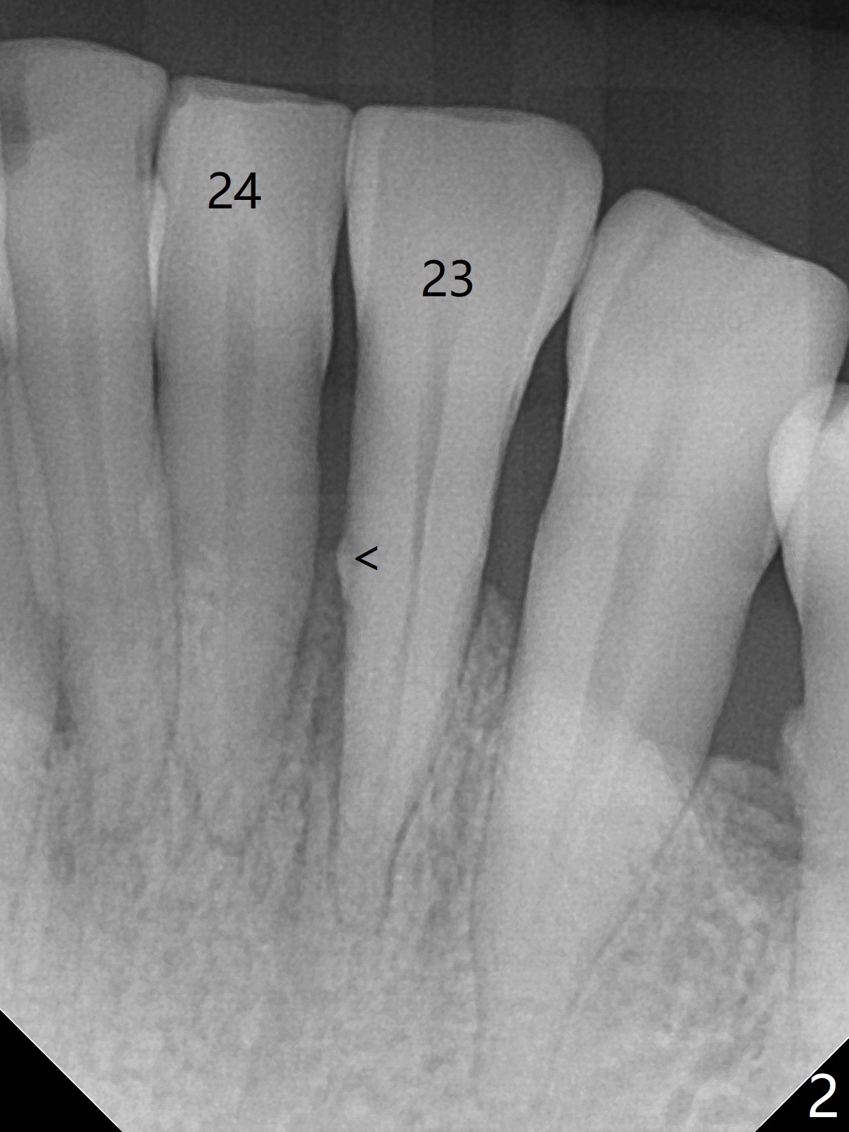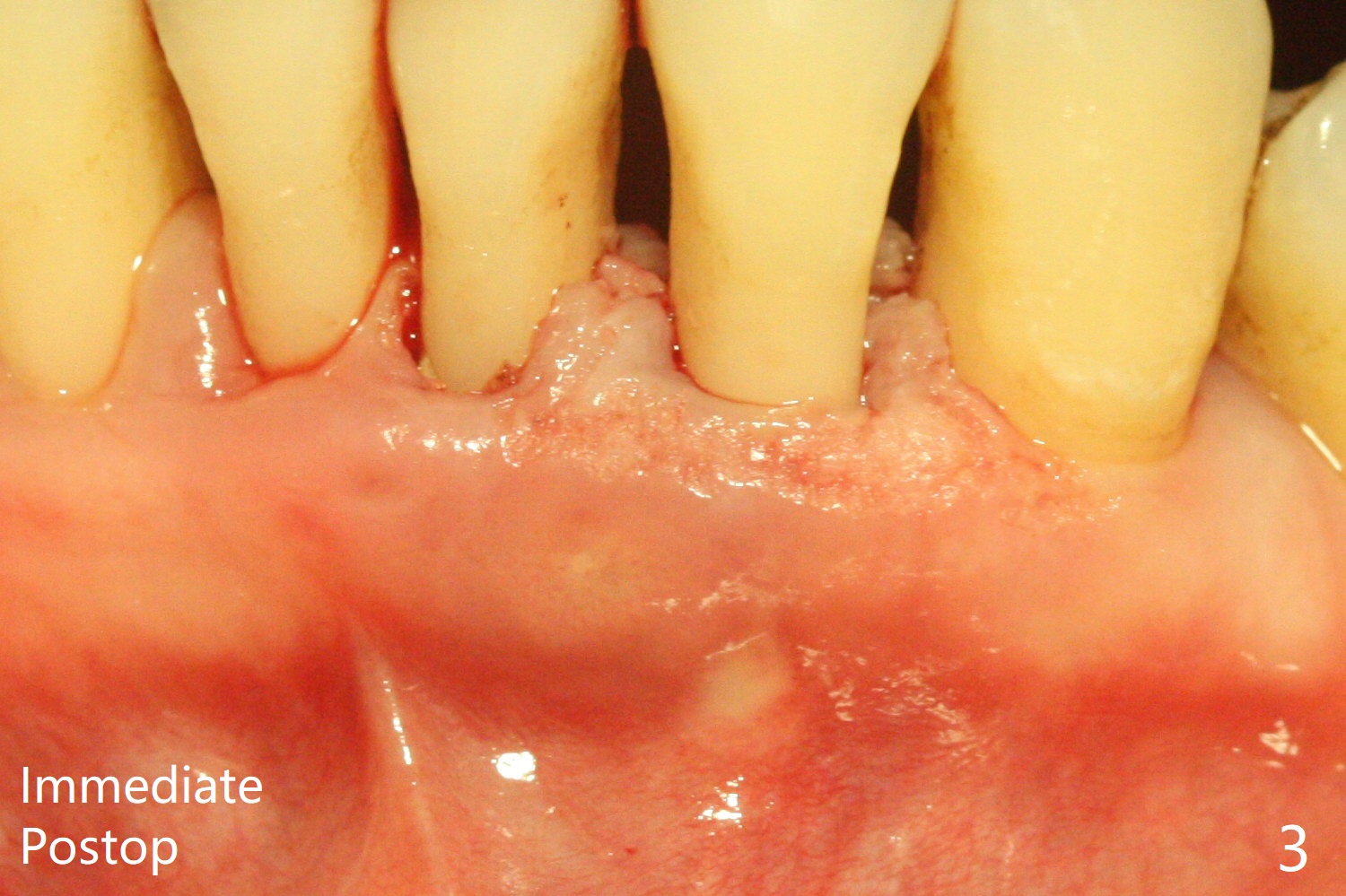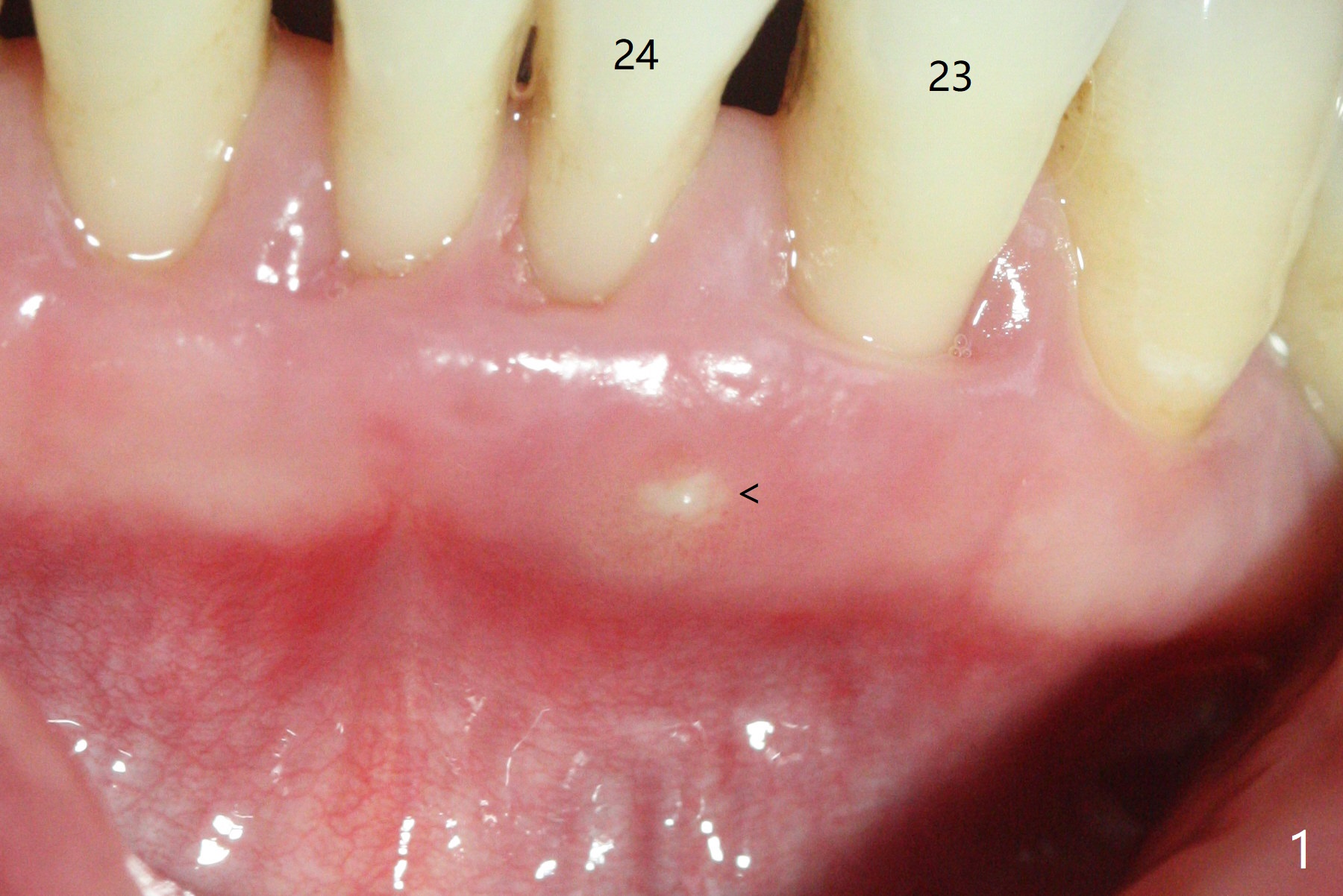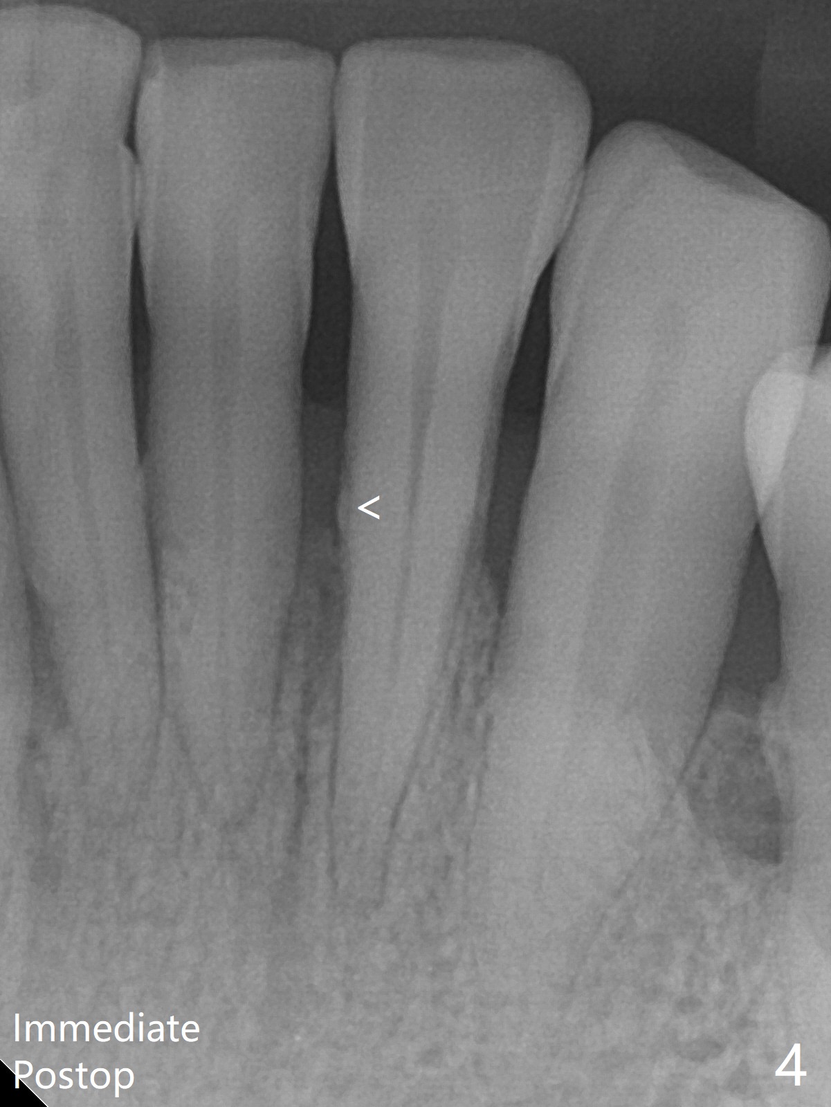 A 45-year-old woman returns for perio maintenance with erythematous and edematous papilla between #23 and 24. Two days later the infection subsides with sinus track (Fig.1 <). With infiltration anesthesia, Waterlase is used for outer and inner (steps 1,3) pocket de-epithelization (and retratction), and sulcular debridement/degranulation (step 5, Fig.3). Gingivectomy (step 2) is omitted because of severe existing gingival recession. Scaling and root planing is not conducted since step 3 seems to be able to remove fine subgingival calculus (Fig.2 <). But it appears not sufficient (Fig.4). Bone decortication should be implemented in future cases (step 6). Mepivacaine is administered in block fashion immediately postop for pain control. The patient is doing fine postop.