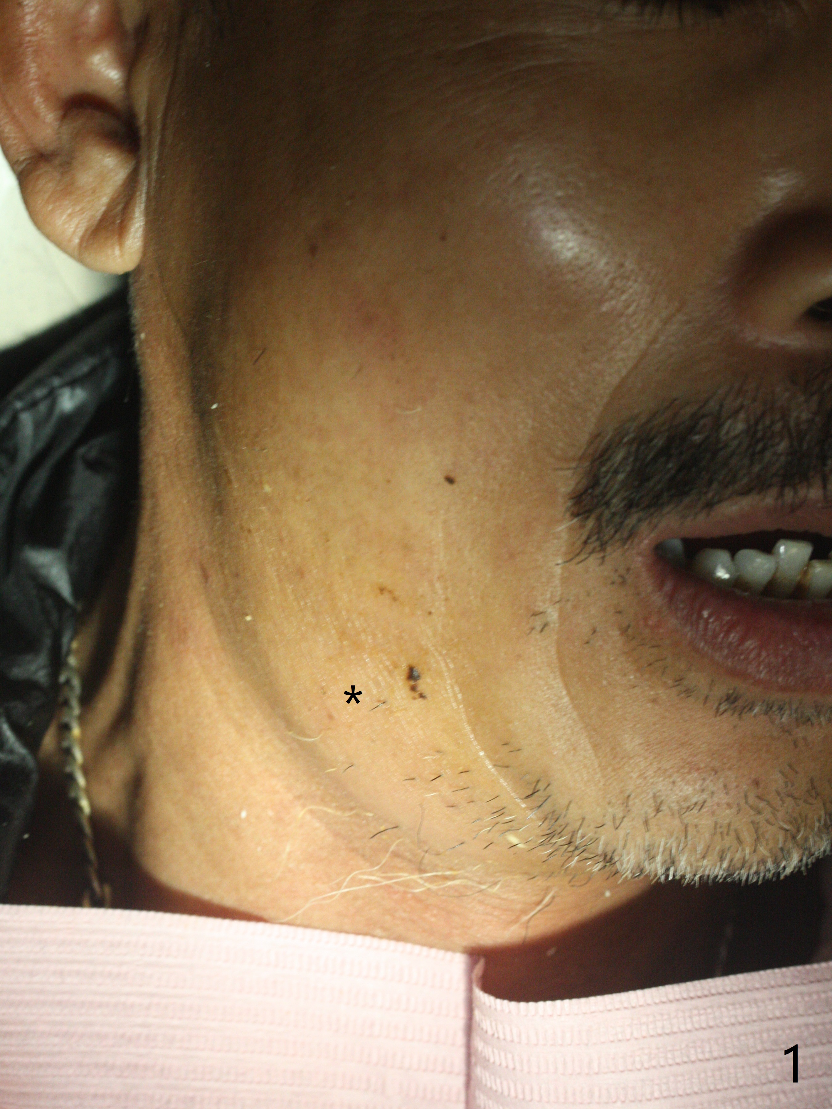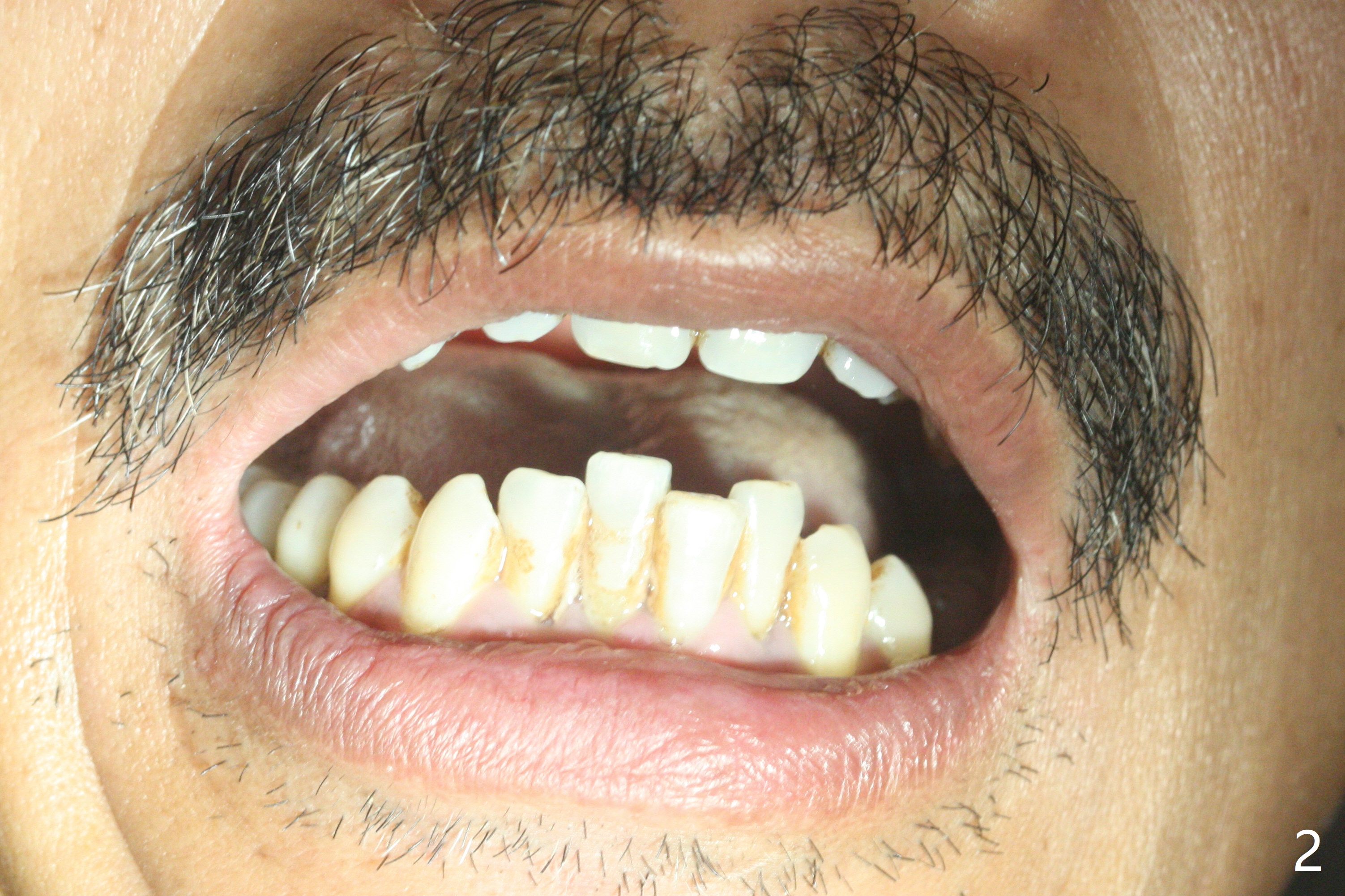 49岁男因右颌下间隙肿胀(图一),张口受限(图二)就诊,伴有右下智齿疼痛,但是他坚持不要拔牙,可能缺失左下5造成不便(图三),没发烧,全身情况还好。你会如何处理?承松:我看口内是否有脓肿,有切开,没有用抗生素。答:由于张口受限,除了颊侧(没有肿胀),其他地方无法检查。看完一个病人后,他在老婆劝导下,同意拔牙。打入不少局麻药,终于张口足够大,拔除智齿,想象脓液像泉水一样流出来,但是一滴都没有。是不是拔错牙?下步该怎么办?在没有办法情况之下,剥离舌侧牙龈,源泉终于出现,按摩舌下间隙,脓液不断。咽侧壁也有肿胀,最后给青霉素处方。