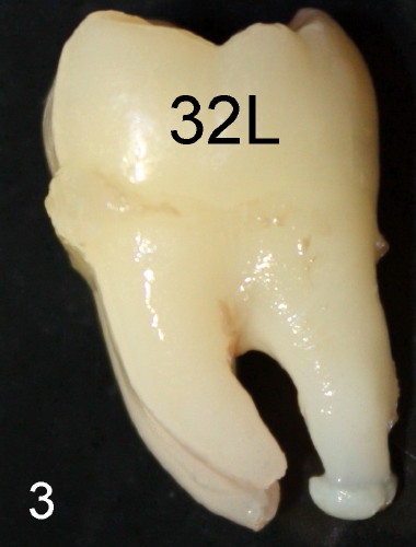 Fig.2 and 3 show that the tooth #32 from 16 year 10 month female has blunt end apices with tooth-forming soft tissue attached to one apex (B: buccal view, L: lingual), back to original article