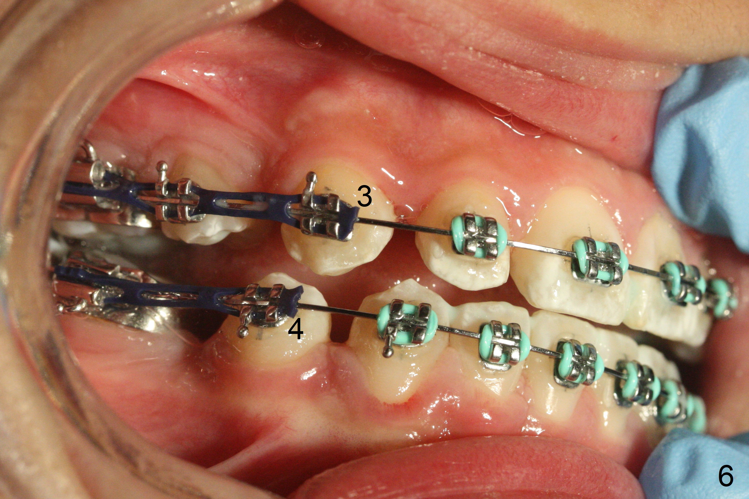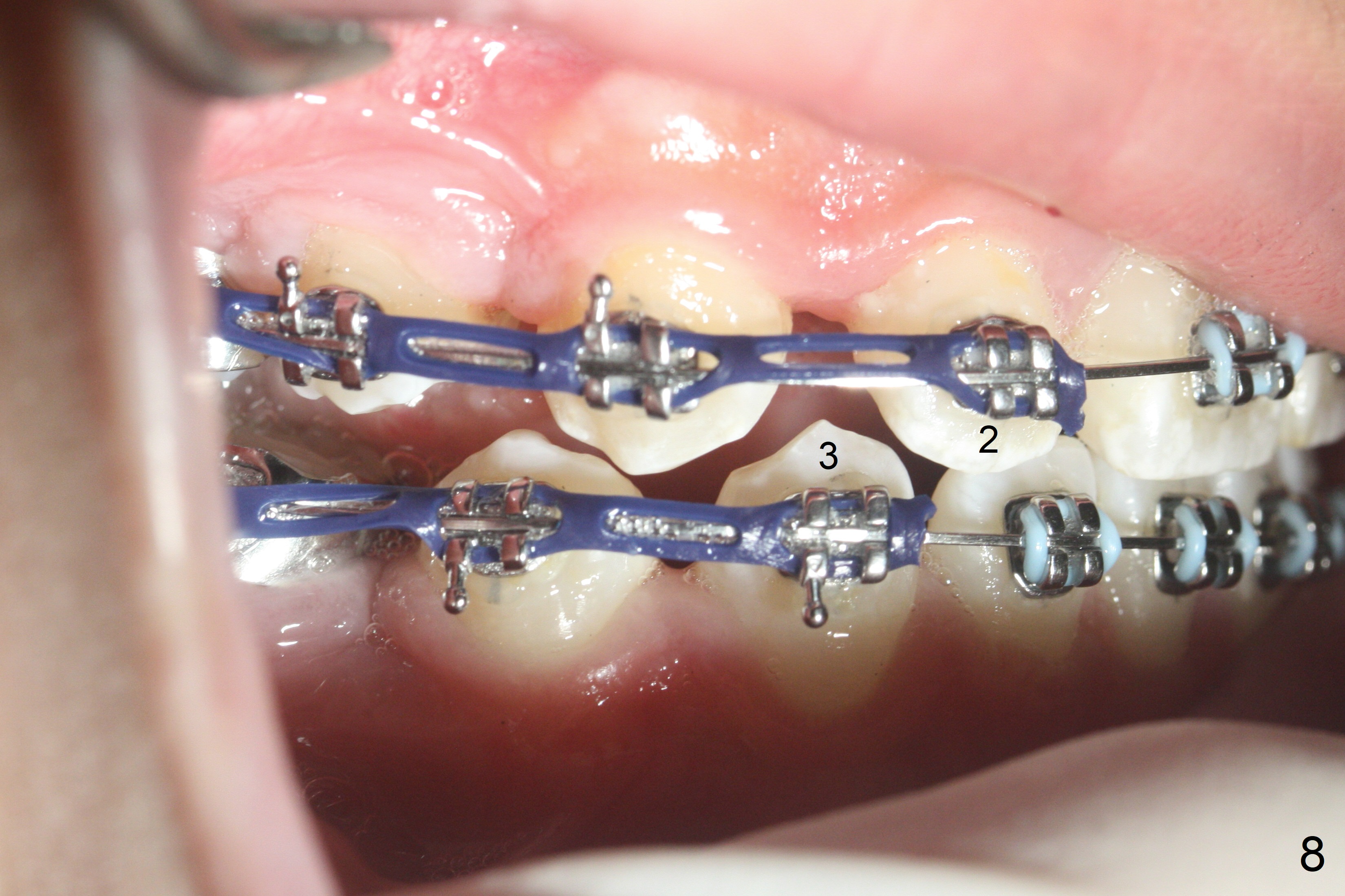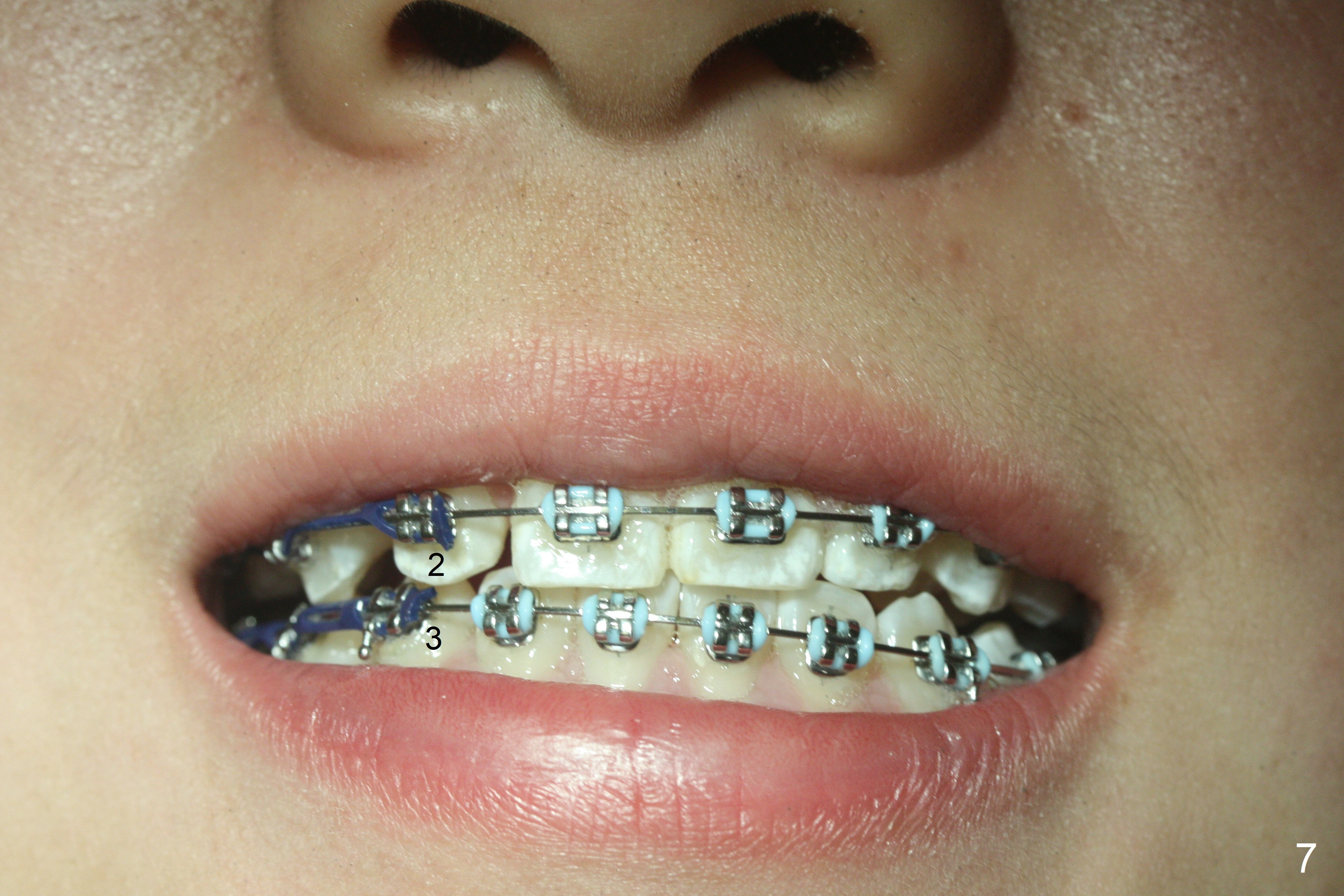 The mother of the 13-year-old girl notes the midline deviation near the end of the treatment (13 months post banding; Fig.1-4). The teeth UR4 and LR5 are extracted for correction of midline deviation. Spaces are created 3 months post extraction and 2 months post retraction with power chain (between UR 3 and 6, LR 4 and 6; Fig.5,6 (16x16 wires)). Next visit pay attention to midline changes. Retract the next mesial teeth (UR2, LR 3) when UR3 and LR4 distalize by 3/4 and 4/5 mm, respectively. In fact 4 months post extraction and 3 months post retraction, the dental midlines remain unchanged, since no spaces have been created by themselves between U1s and between LR1-2 (Fig.7,8); power chains are extended mesially after arch wires are changed to 16x22. The periodontal ligament between the neighboring teeth contributes to self drifting. Place figure-8 wire between the posterior teeth as anchorage if anterior tooth shifting is required.
