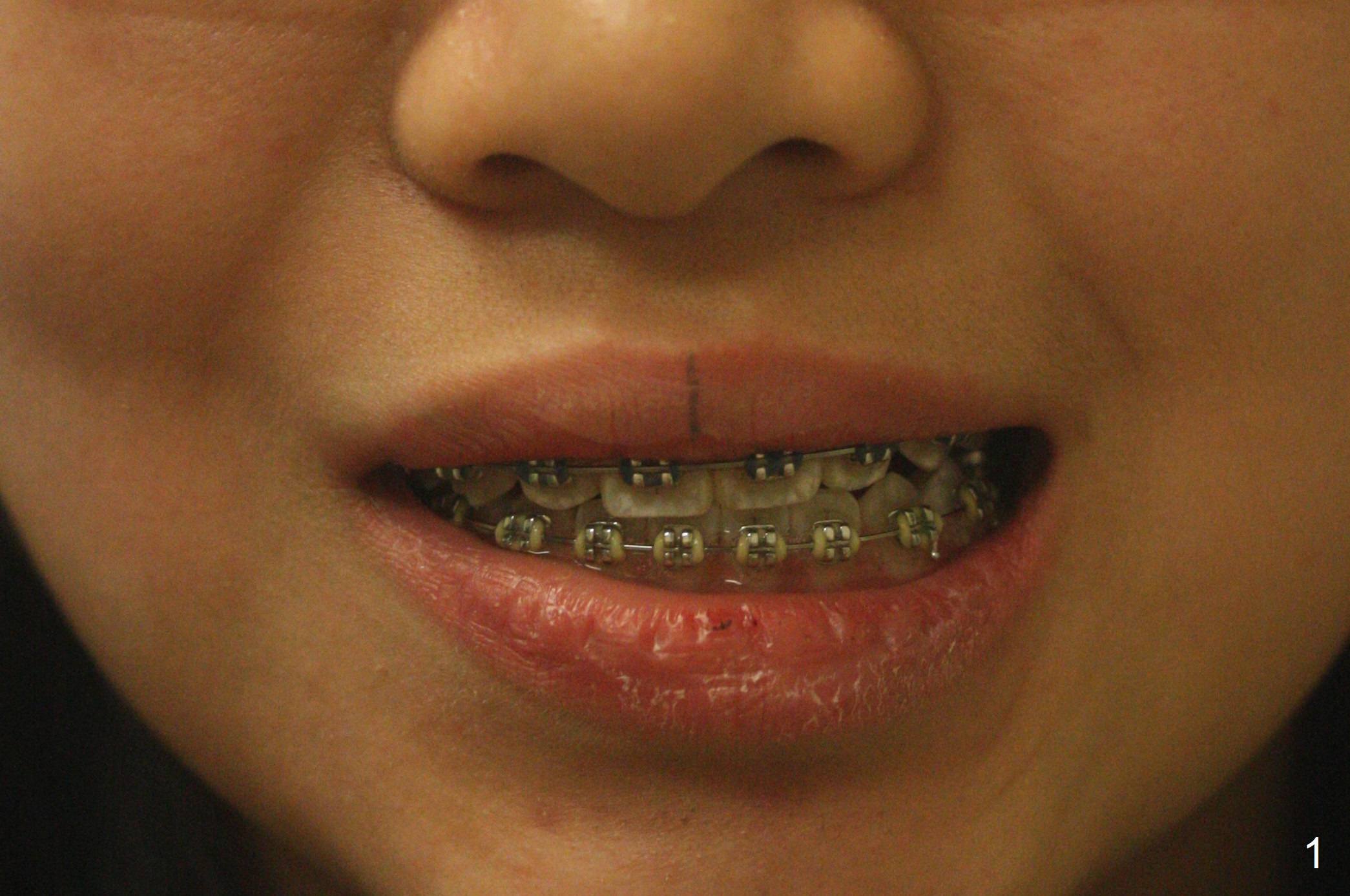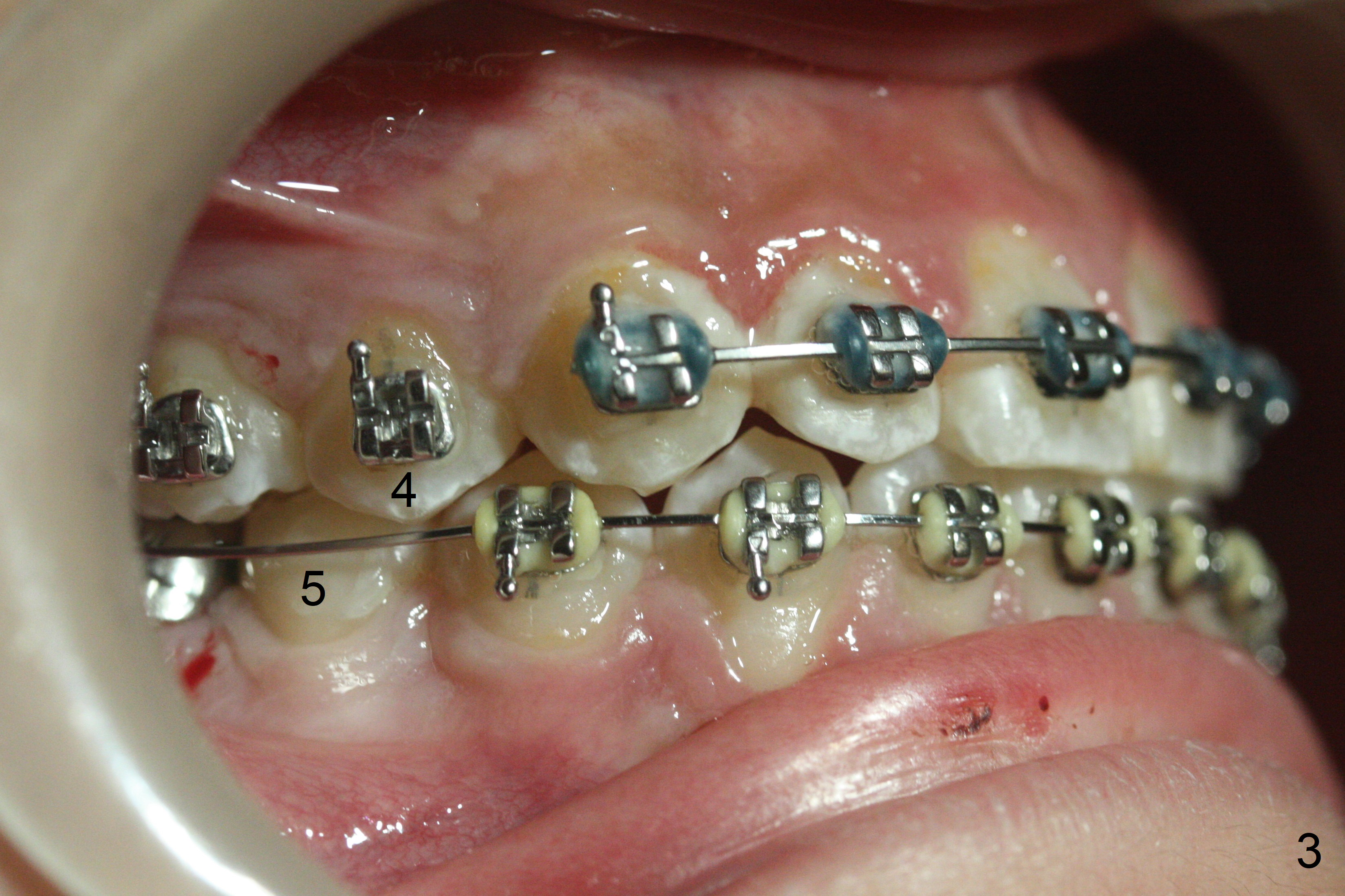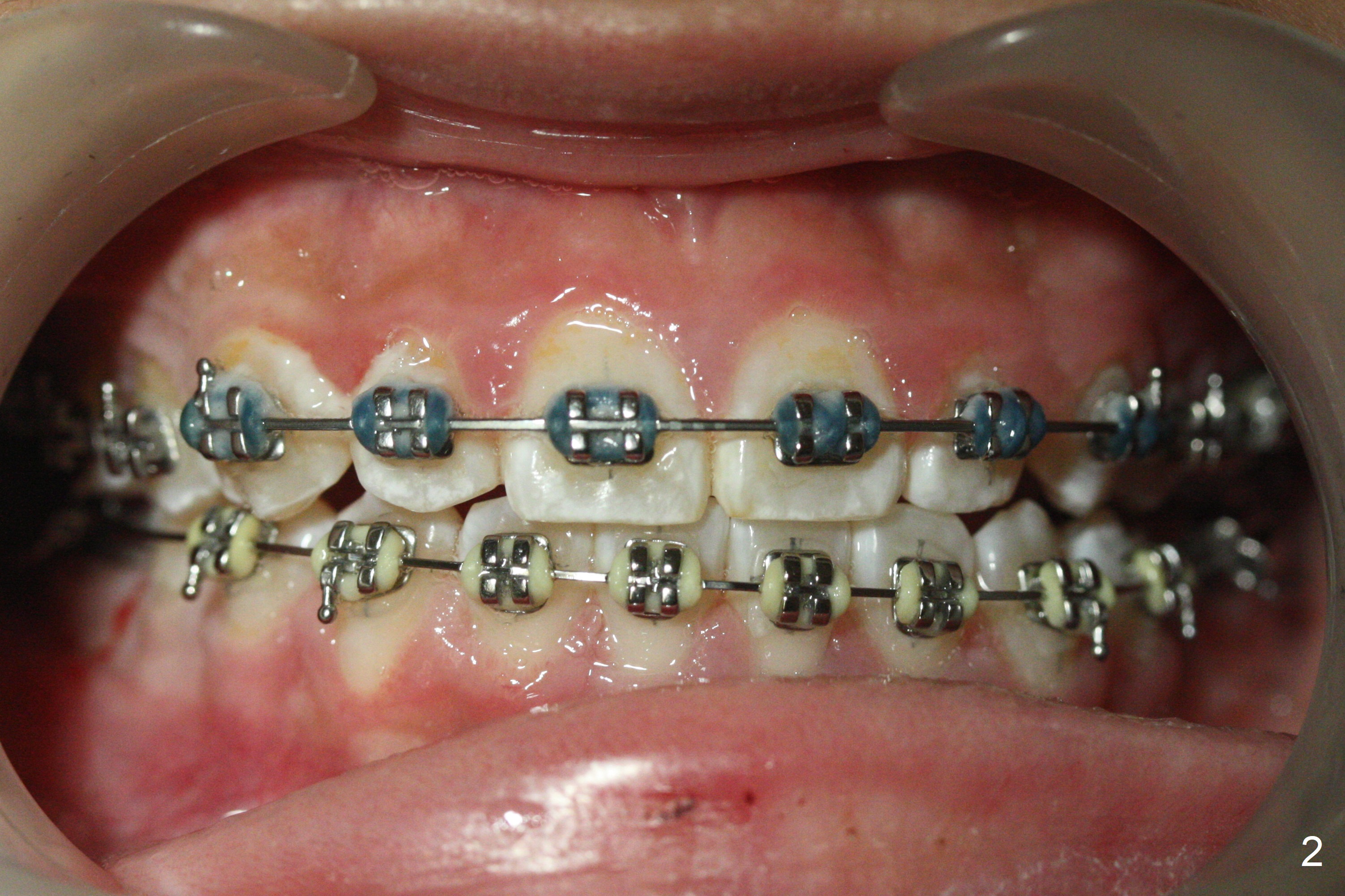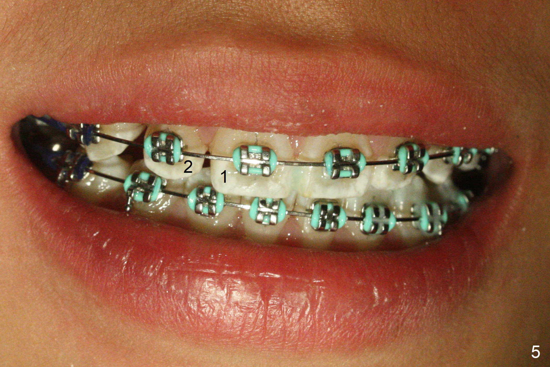 The mother of the 13-year-old girl notes the midline deviation near the end of the treatment (13 months post banding; Fig.1-4). The teeth UR4 and LR5 are extracted for correction of midline deviation. Spaces are created 3 months post extraction and 2 months post retraction with power chain (between UR 3 and 6, LR 4 and 6; Fig.5,6 (16x16 wires)). Next visit pay attention to midline changes. Retract the next mesial teeth (UR2, LR 3) when UR3 and LR4 distalize by 3/4 and 4/5 mm, respectively. In fact 4 months post extraction and 3 months post retraction, the dental midlines remain unchanged, since no spaces have been created by themselves between U1s and between LR1-2 (Fig.7,8); power chains are extended mesially after arch wires are changed to 16x22. The periodontal ligament between the neighboring teeth contributes to self drifting. Place figure-8 wire between the posterior teeth as anchorage if anterior tooth shifting is required.