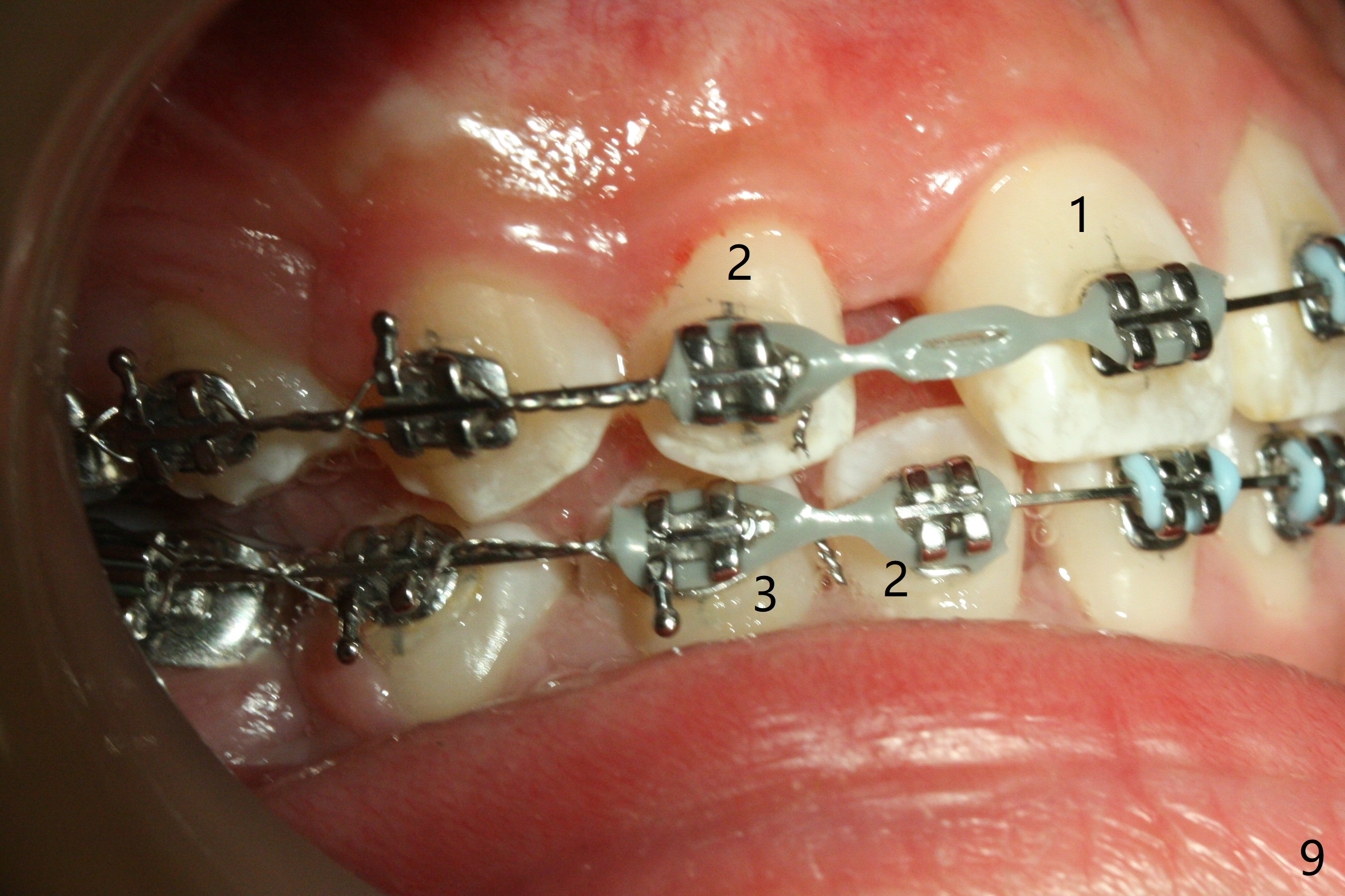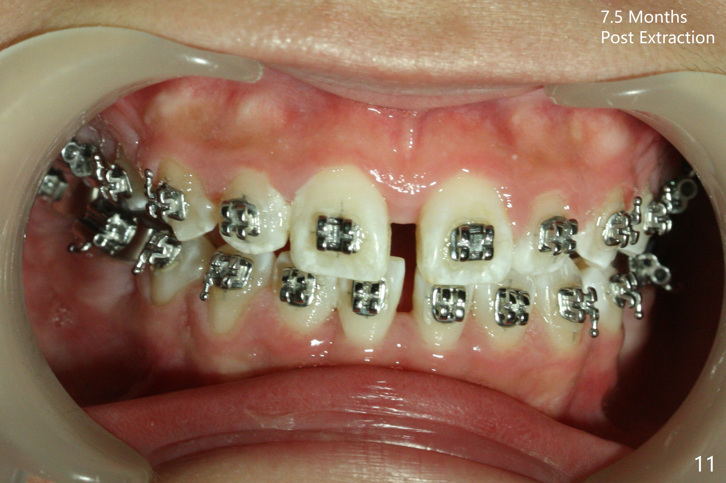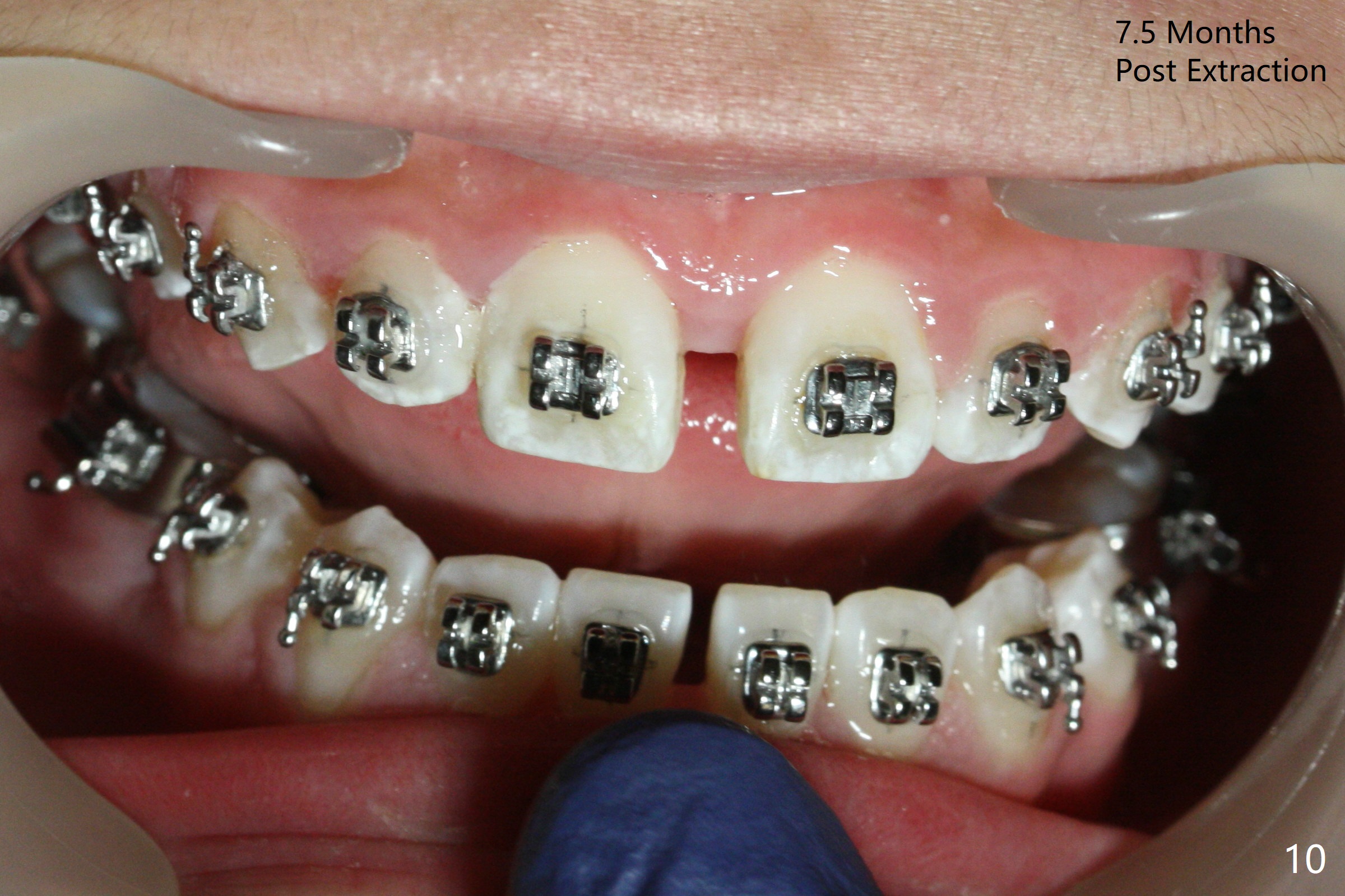 In fact retraction of UR2 does not distalize UR1, while retraction of LR3 distalizes LR2 partially (Fig.9, nearly 6 months post extraction). Ligature wire is used to tie UR2-6 and LR 3-6 as anchors to distalize UR1 and LR2. UR1 retracted distal, midline matches, LR1 shy 1 mm from midline, with R1-6 tie, retract L1s to R with power chains x4 (L x3,x4; Fig.10,11 (7.5 months post extraction)).
