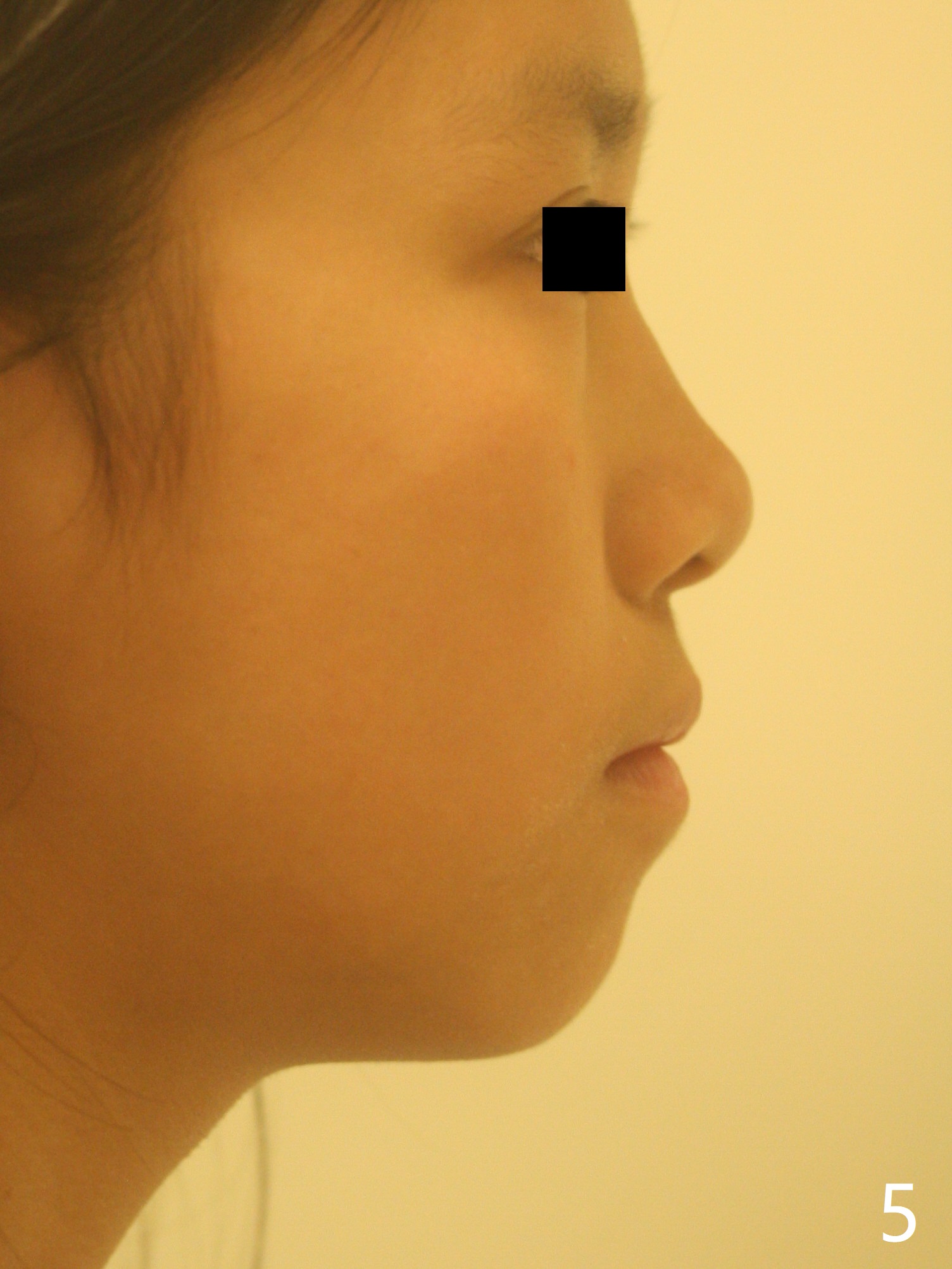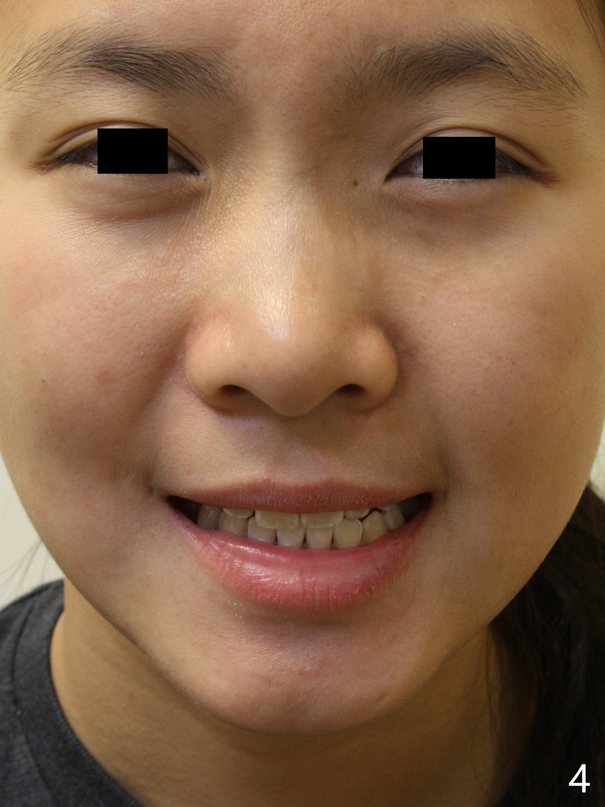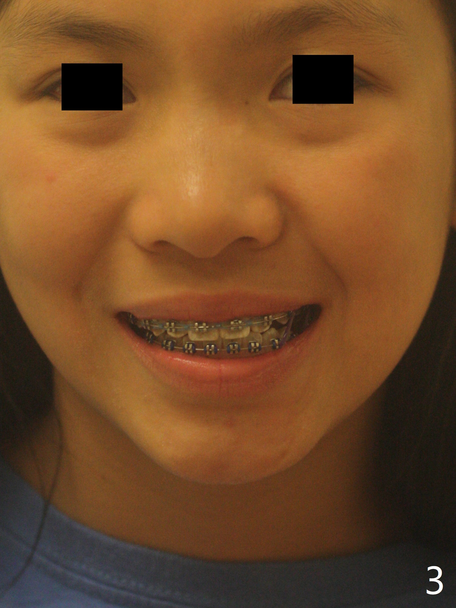 A 11-year-old woman does not have UL3 and LL5 congenitally with retention of their precedent teeth (Fig.1,3,5,7,9 C, E). Her mother rejects implant option and insists on non-extraction orthodontics. When alignment is achieved, she notes the midline issue (dashed line in Fig.1) and agrees upon extraction (UR4 and LR5). The total treatment is 2 years 7 months. Before photos are taken nearly 3 months post banding, while after ones immediately post debanding.