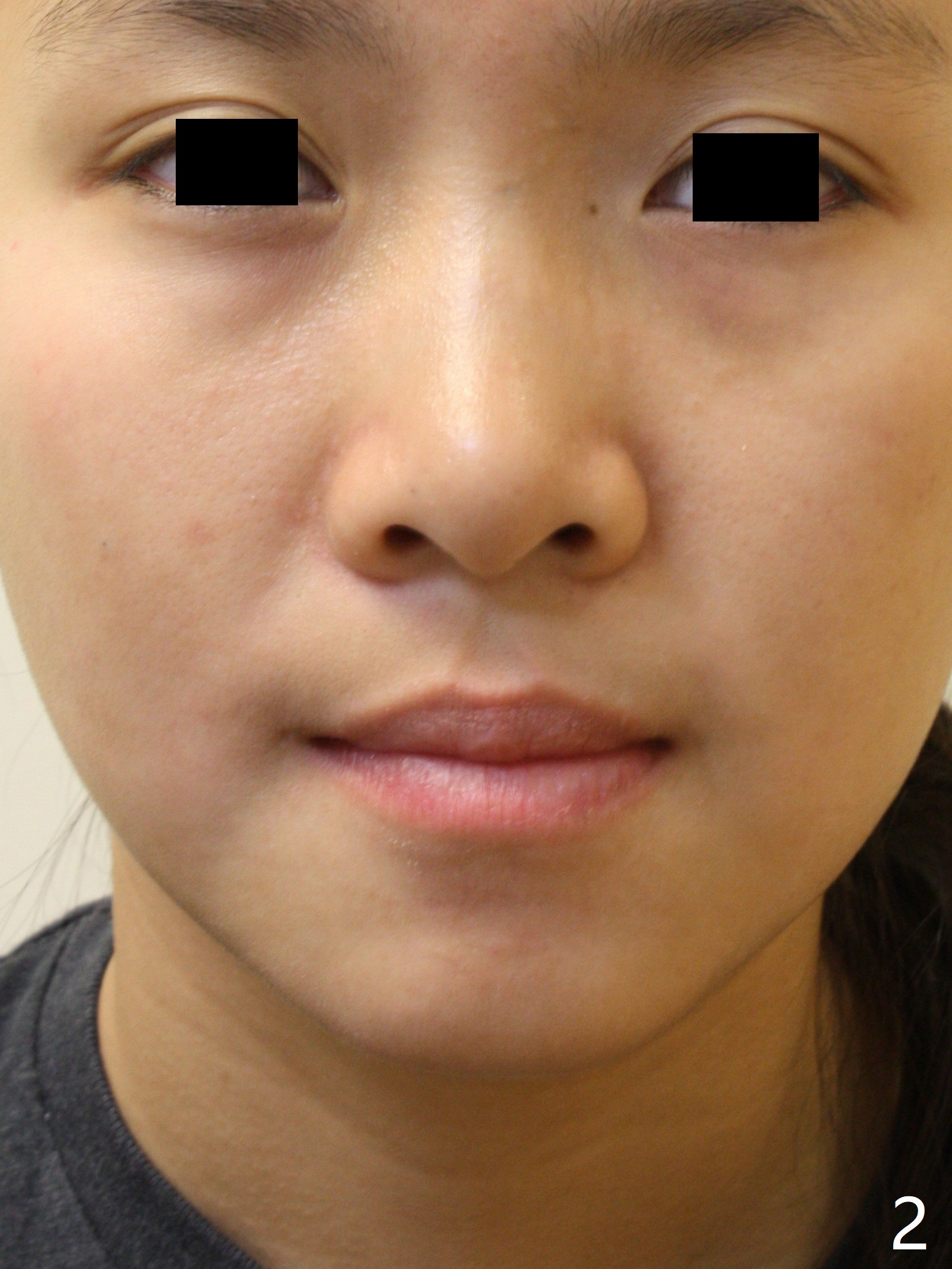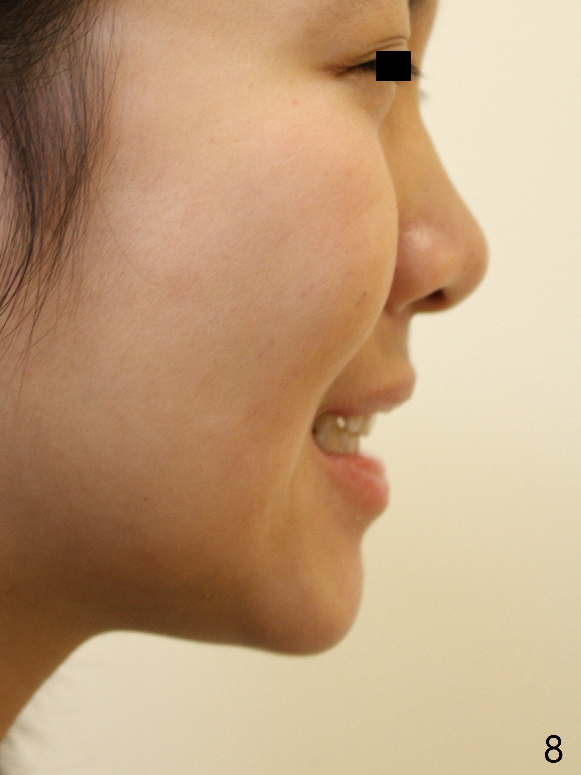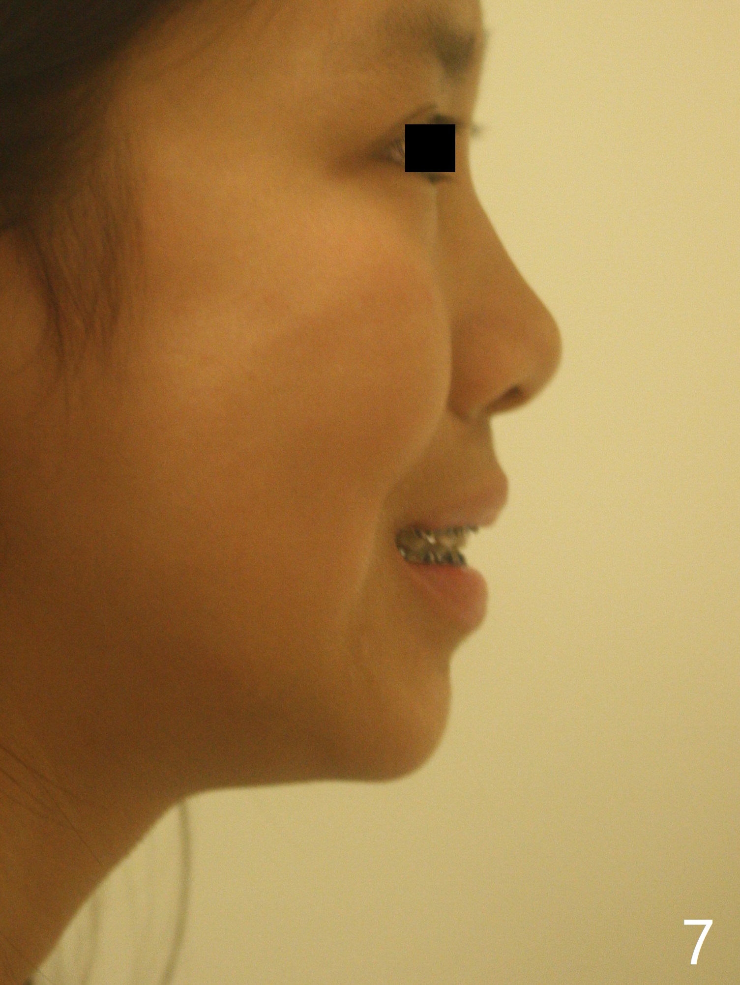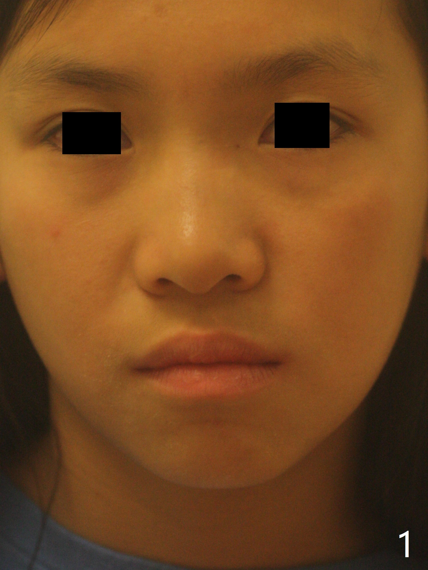 A 11-year-old woman does not have UL3 and LL5 congenitally with retention of their precedent teeth (Fig.1,3,5,7,9 C, E). Her mother rejects implant option and insists on non-extraction orthodontics. When alignment is achieved, she notes the midline issue (dashed line in Fig.1) and agrees upon extraction (UR4 and LR5). The total treatment is 2 years 7 months. Before photos are taken nearly 3 months post banding, while after ones immediately post debanding.