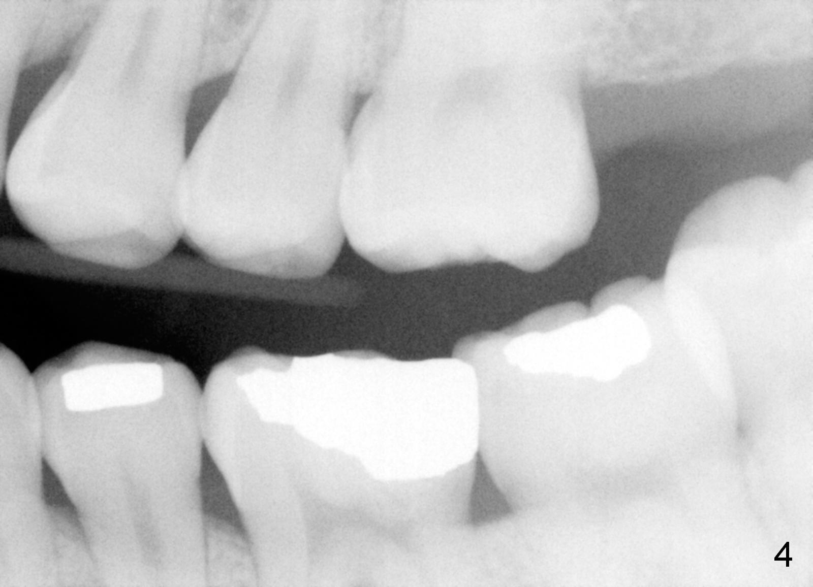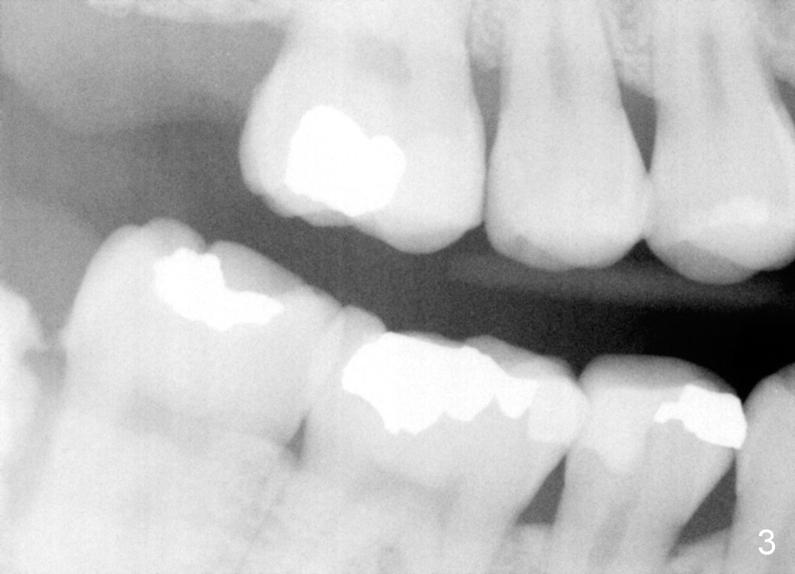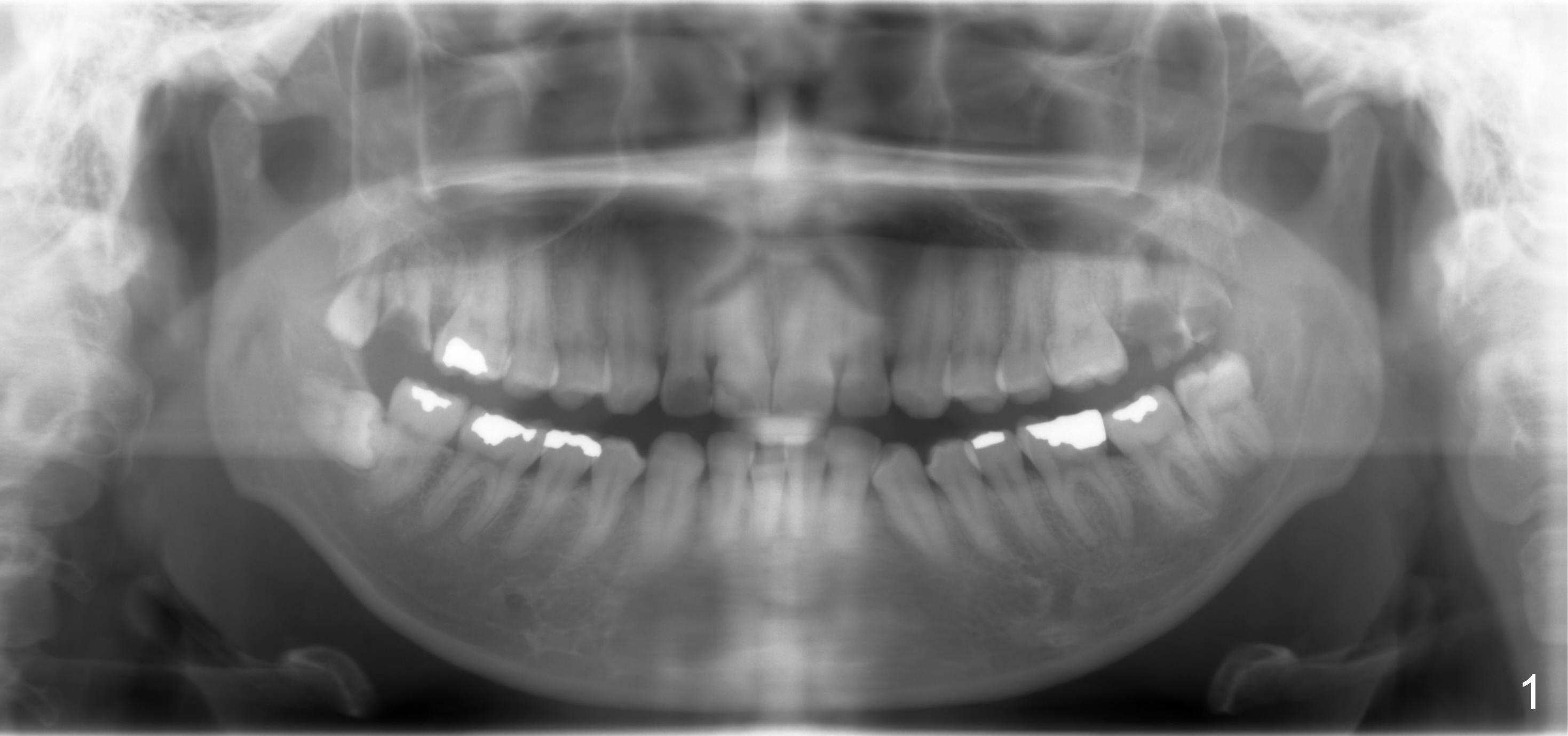 The panoramic X-ray (Fig.1) was taken on 12/12/2011 when the teeth #15 and 16 were extracted. The teeth #1 and 2 were removed half a year later. Bitewings (Fig.2-5), PAs (Fig.6,7) and upper occlusal mirror photo were taken on 02/11/2015. Pay attention to Fig.2.