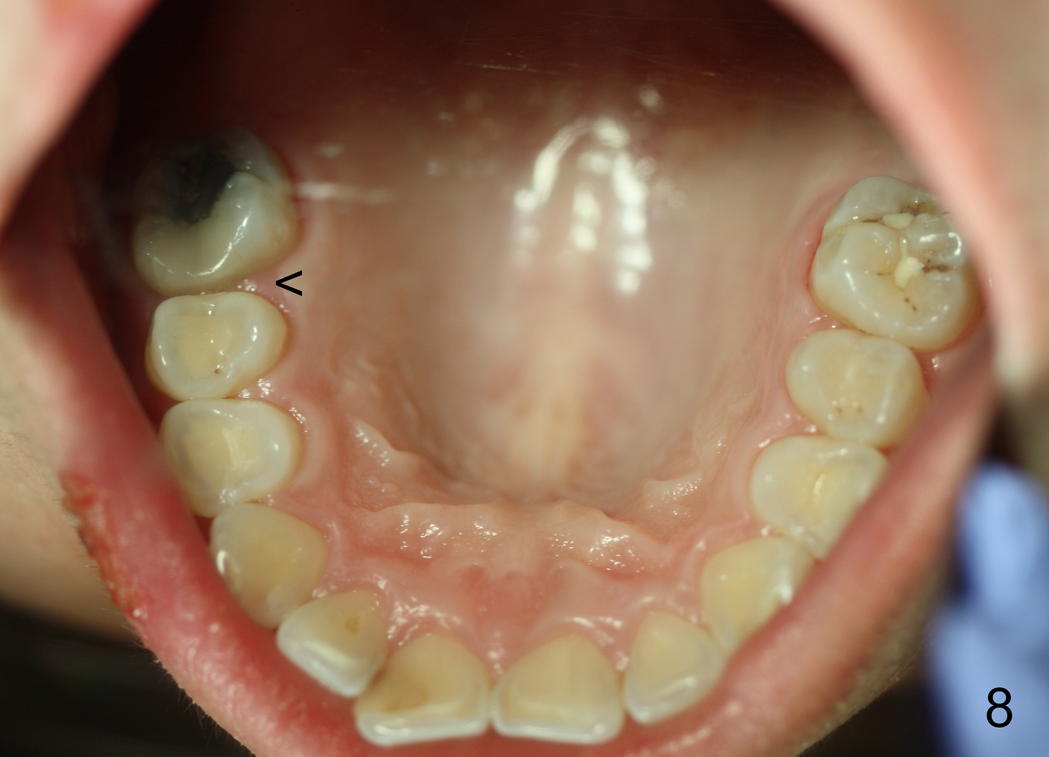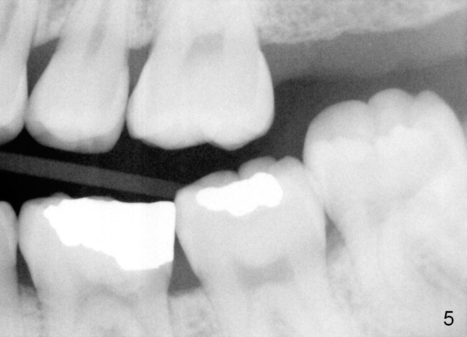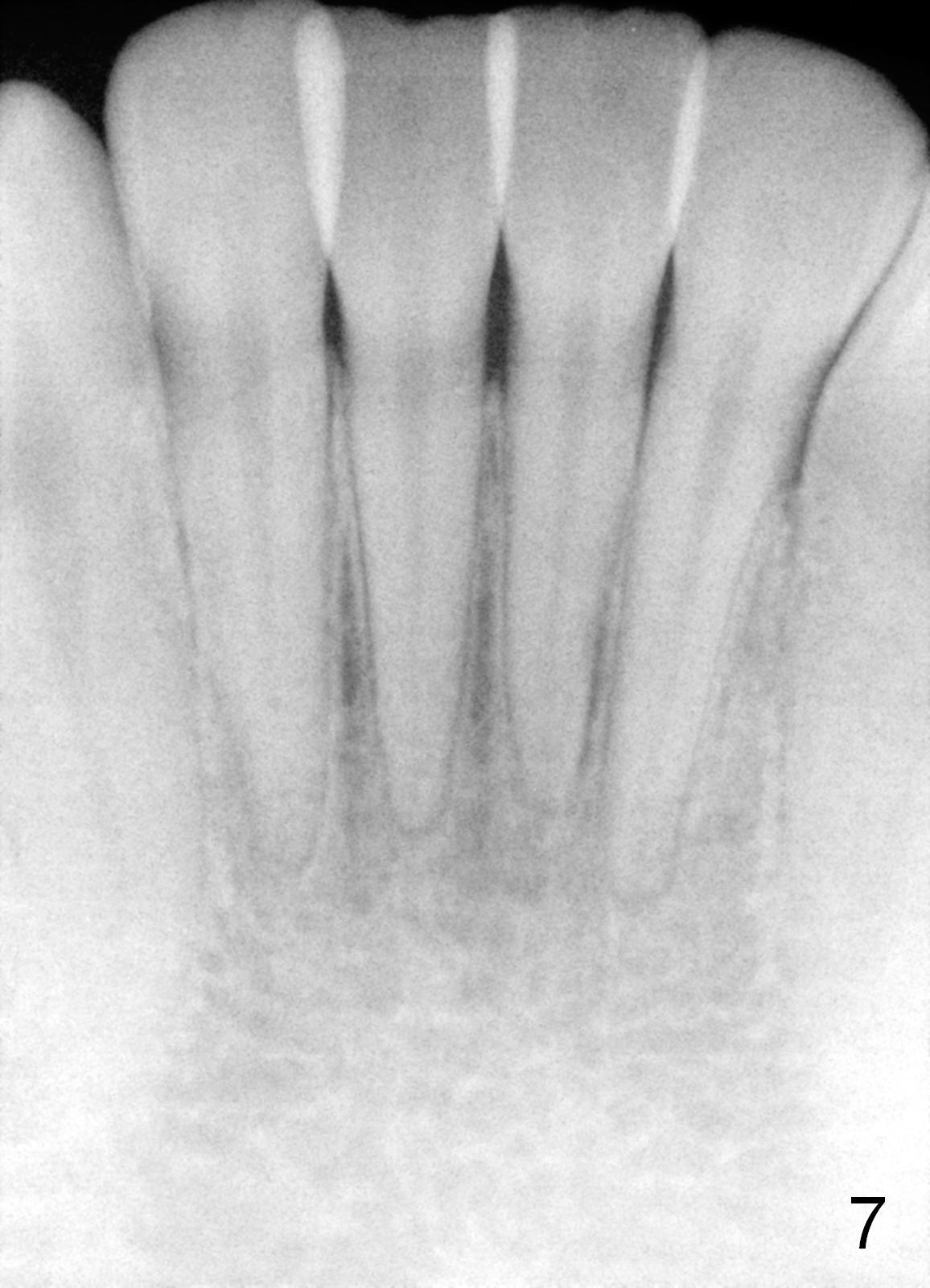 The panoramic X-ray (Fig.1) was taken on 12/12/2011 when the teeth #15 and 16 were extracted. The teeth #1 and 2 were removed half a year later. Bitewings (Fig.2-5), PAs (Fig.6,7) and upper occlusal mirror photo were taken on 02/11/2015. Pay attention to Fig.2.