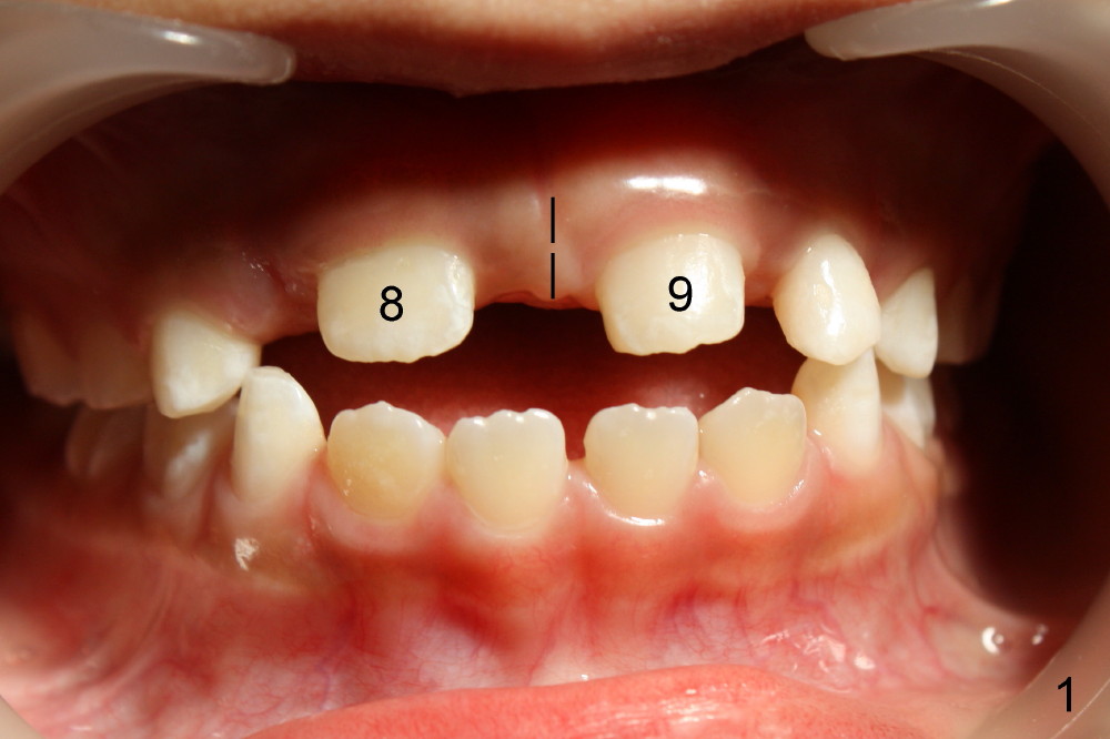 A seven-year-old co-operative boy presented to my office for composite. Exam shows open bite and a large diastema between the erupting upper central incisors (Fig.1-4). His mother notices that the diastema is more due to lateral displacement of the right central than the left central's (compare to Fig.1: black dashed line). She asks whether the uneven displacement will interfere with eruption of the upper right lateral incisor (Fig.2,3, as compared to Fig.4). She is interested in early ortho.