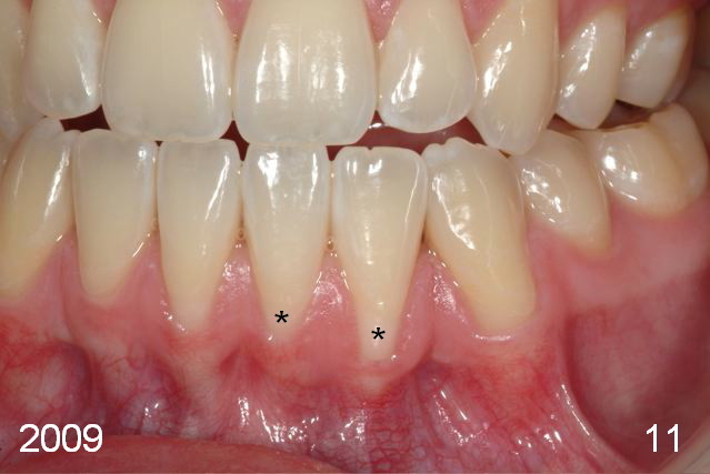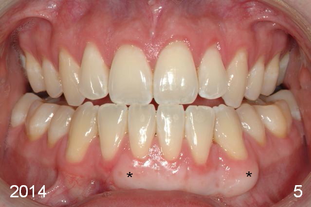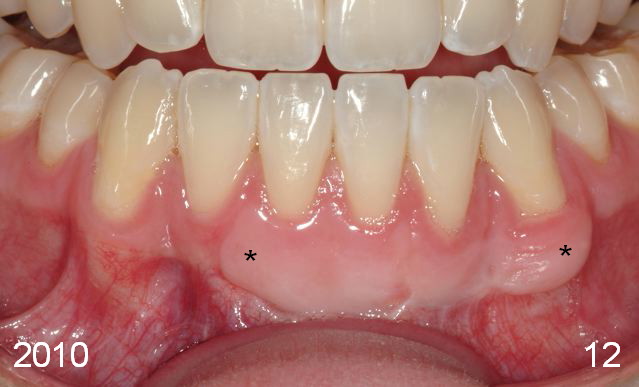 The labial gingival recession of the lower anterior teeth (Fig.11) was treated with gingival graft (Fig.5,12*). One of the last things Chip Webster did before he died! God rest his soul.