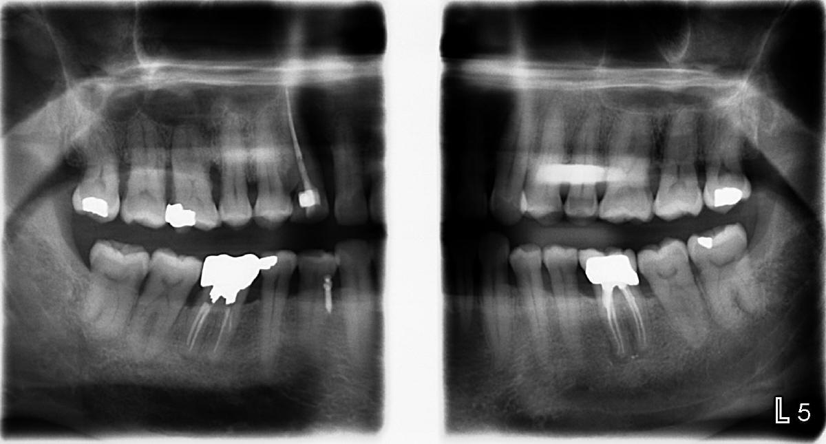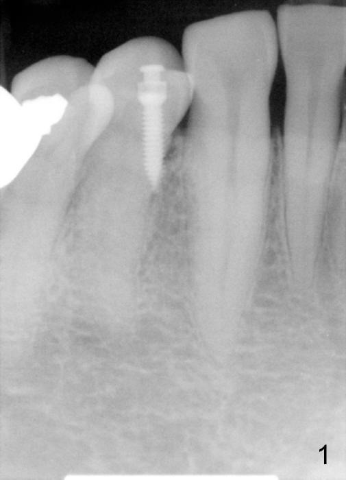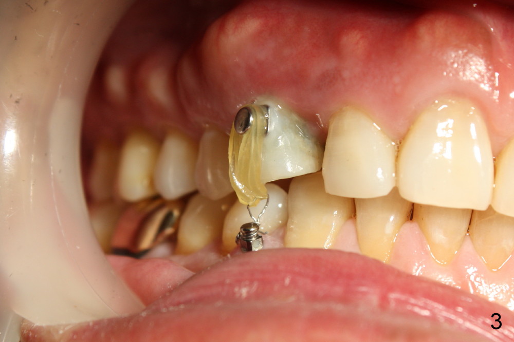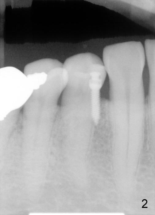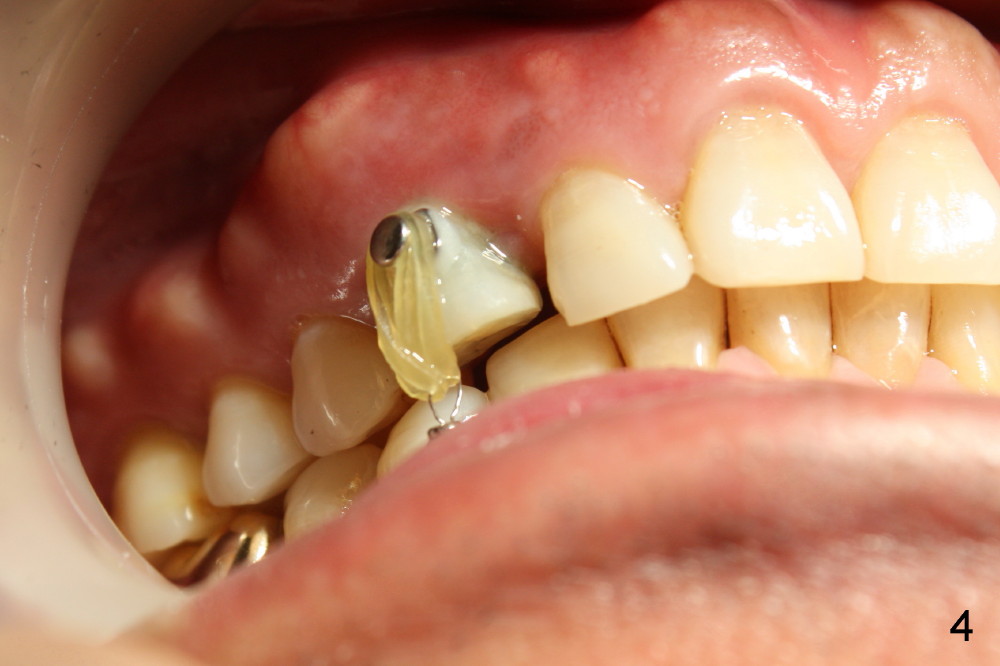 Finally the implant is removed. At the same entry point, the trajectory is changed, perpendicularly to the buccal plate. It turns out to be loose in a few days. Probably it perforates the crestal bone. It is removed later. The mini-implant is placed in the attached gingiva, where irritation is minimal. But it is not good for the bone.