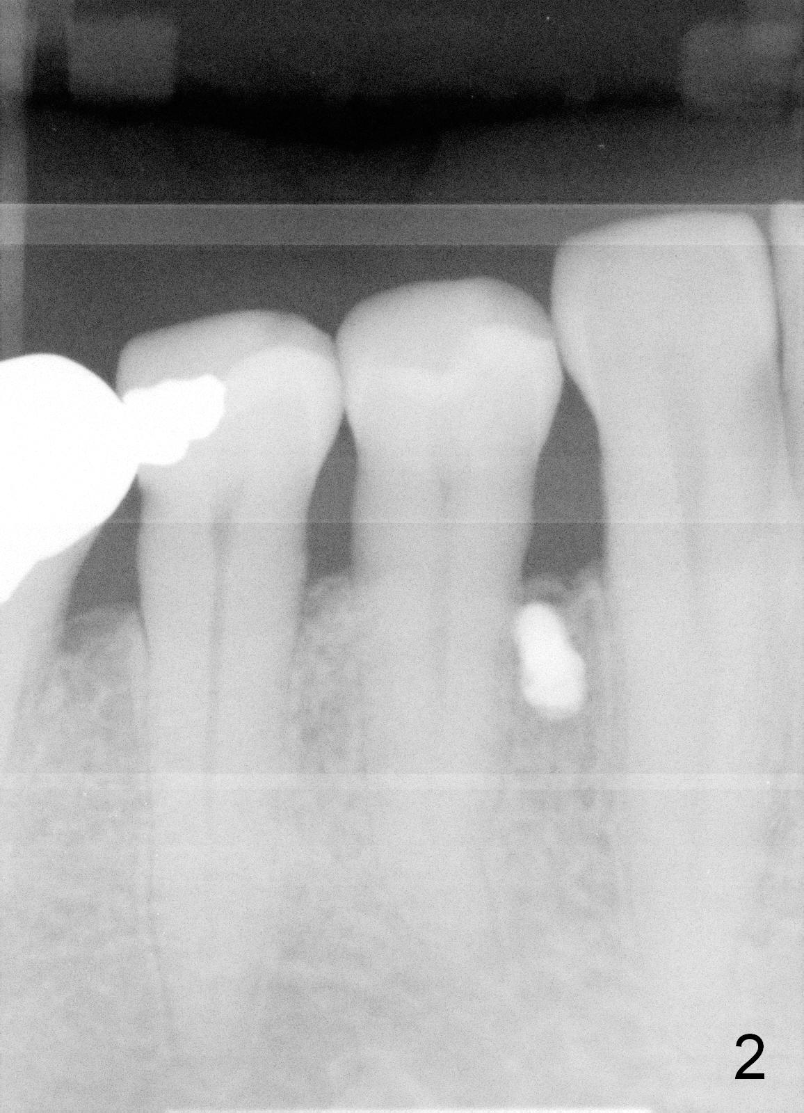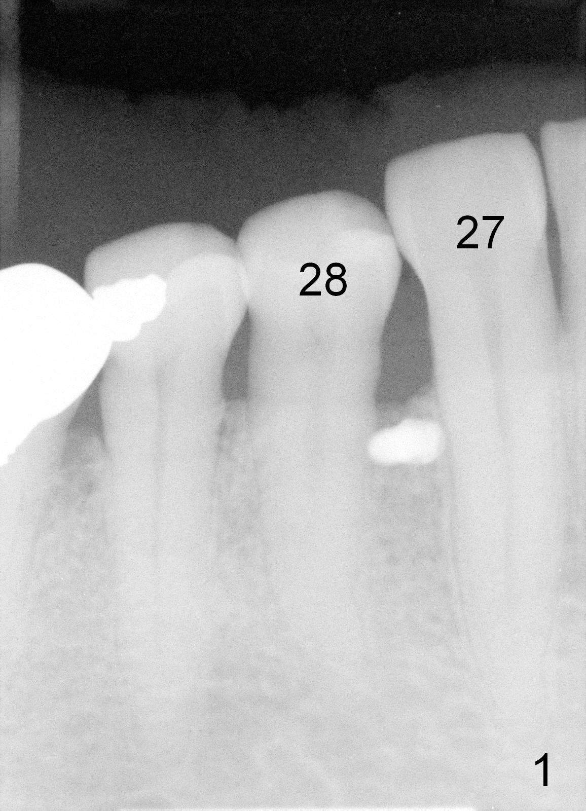 The first two times of mini-implant placement is done without incision or pilot drill. The third time, a vertical incision is made between the teeth #27 and 28 after minimal buccal injection. A pilot drill is placed just coronal to the mucogingival junction (MGJ). It quickly become unstable. An exploration shows that the lingual half of the bone is soft and tender, probably entering the previous osteotomy. Therefore the pilot drill has to be moved slighly apical to MGJ. After penetration of the buccal cortex by the drill, a 1.6x6 mm mini-implant is placed initially (Fig.1). Then the trajectory is changed away from the tooth #28, while the implant is placed deeper. There is great resistance before the implant is fully placed (Fig.2). The patient feels mild discomfort lingually, but there is no sign of lingual plate penetration. Postop, the contact between #28 and 29 is tightened. Cross arch retraction starts immediately.