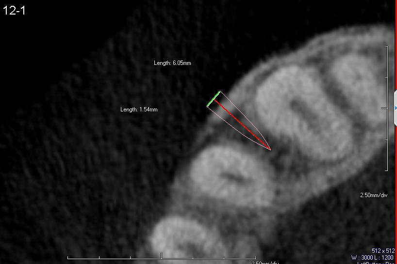 Fig.12-1 (CBCT: axial section): A mini-implant (6 mm long, 1.6 mm in diameter) will be placed between the teeth #27 and 28.