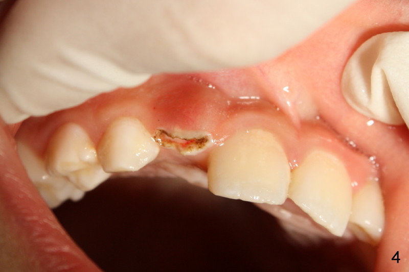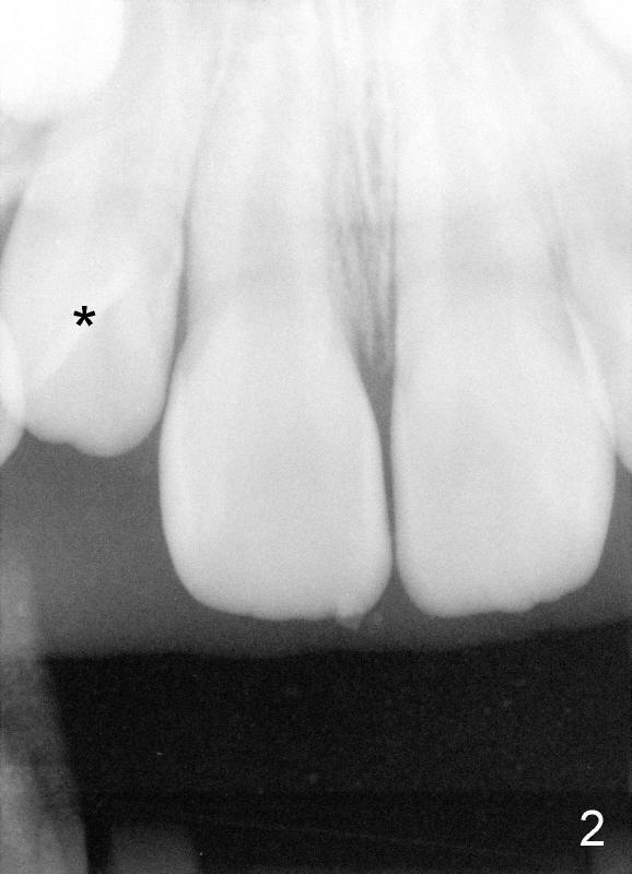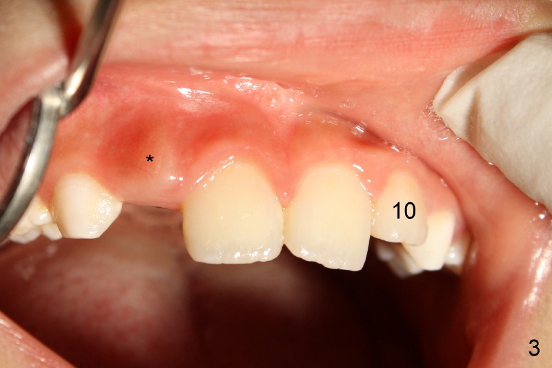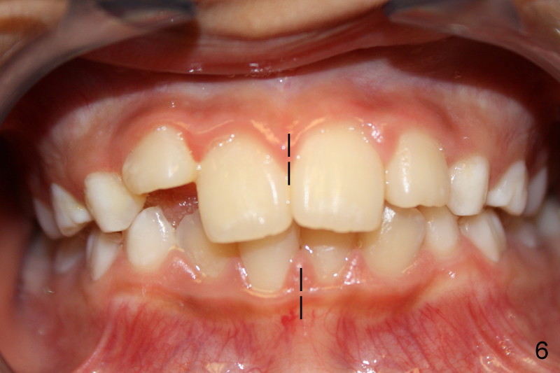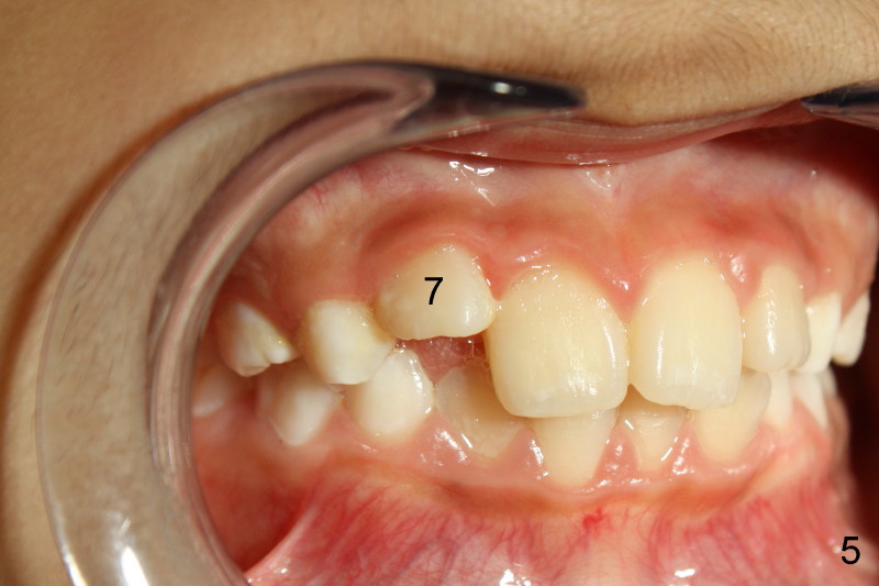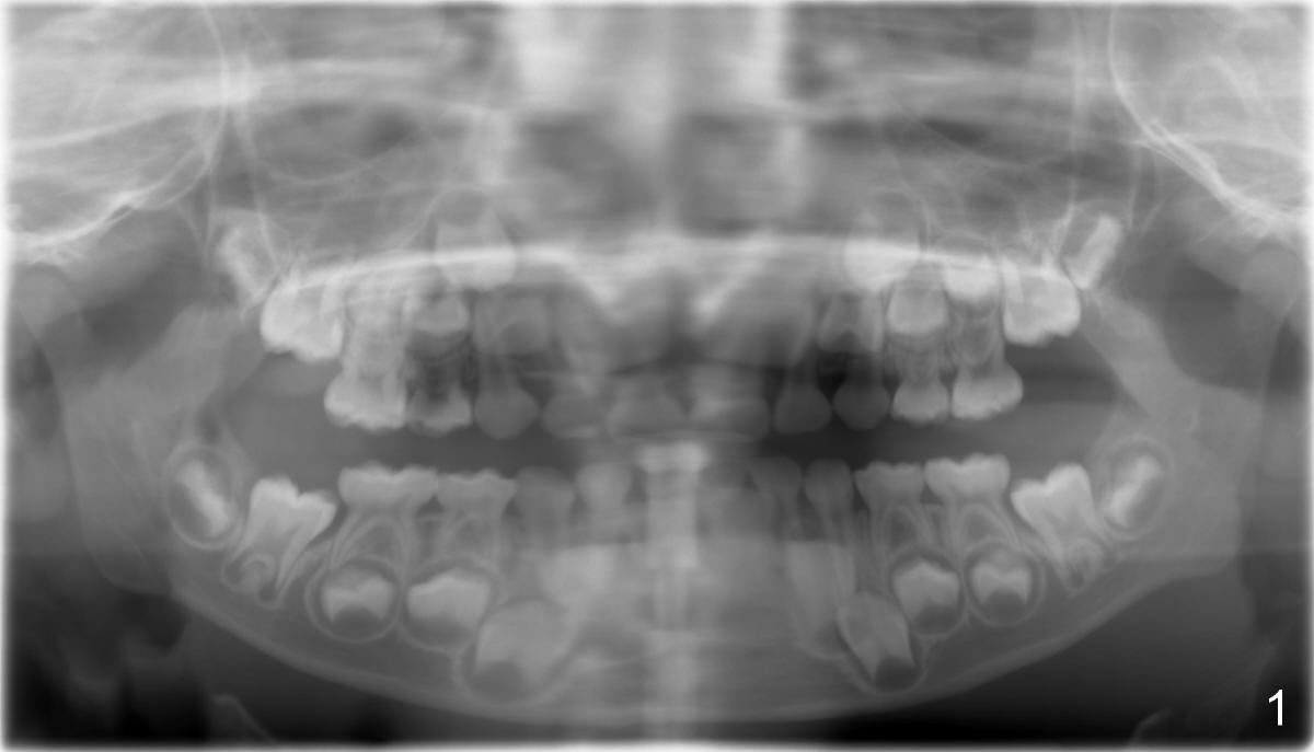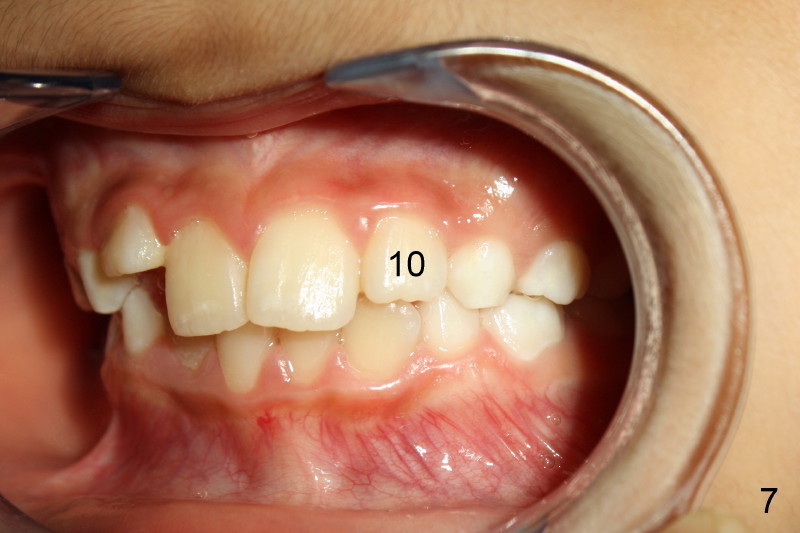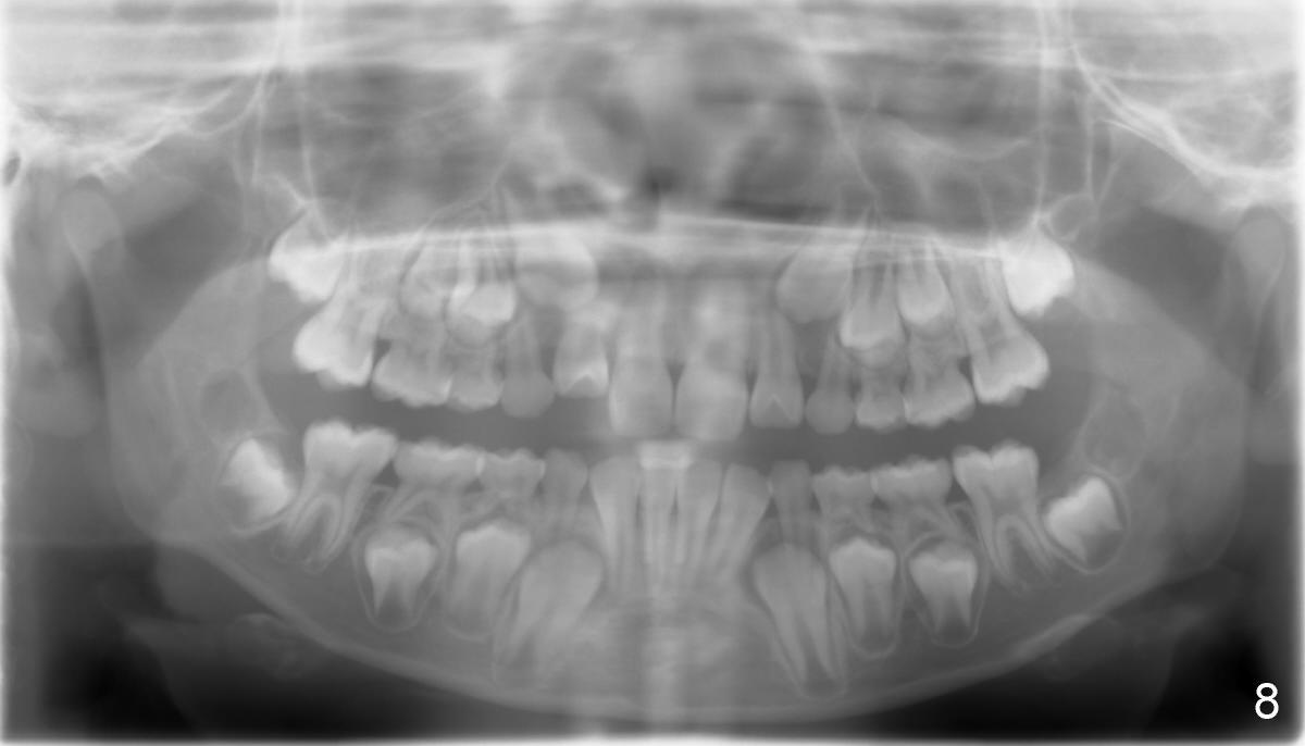 Panramic X-ray was taken when Edward was 6 years 5 months old (Fig.1). His parents and he himself found that the upper right lateral did not erupt at the age of 9 years 2 months (Fig.2-4: *). Gingivectomy was performed using soft tissue laser to expose the incisal edge of the lateral. Five months later, the lateral has erupted partially (Fig.5-8), but the family is concerned about the cosmetic issue. It appears that the upper midline has shifted to the right (Fig.6). Periapical film is planned to take to confirm the relationship between the canine and the lateral.