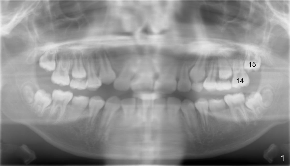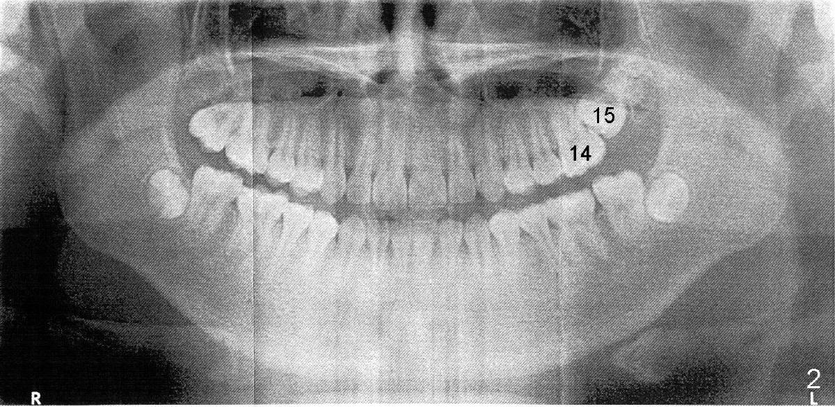 shows that the tooth #15 (upper left 2nd molar) is impacted (Fig.2).