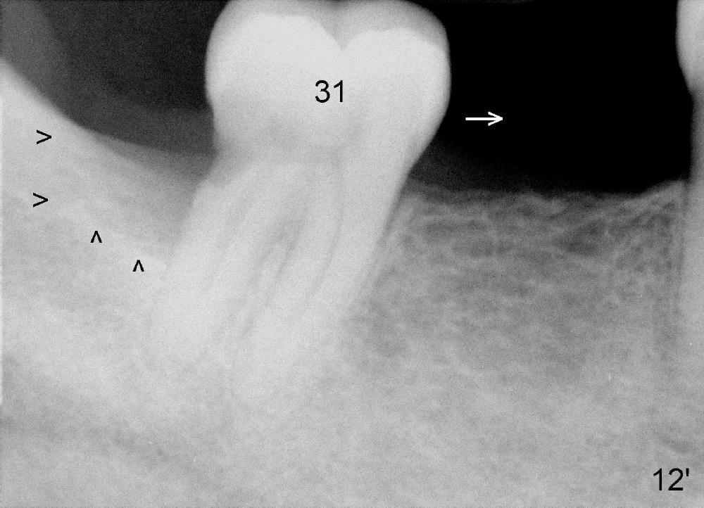 | Fig.12': Preop, #31 shifts mesially (white arrow). There is a large bony defect distally (black >). | Fig.12: 9 months postop. The distal bony defect decreases (black >) as #31 distalizes. Return to original article |