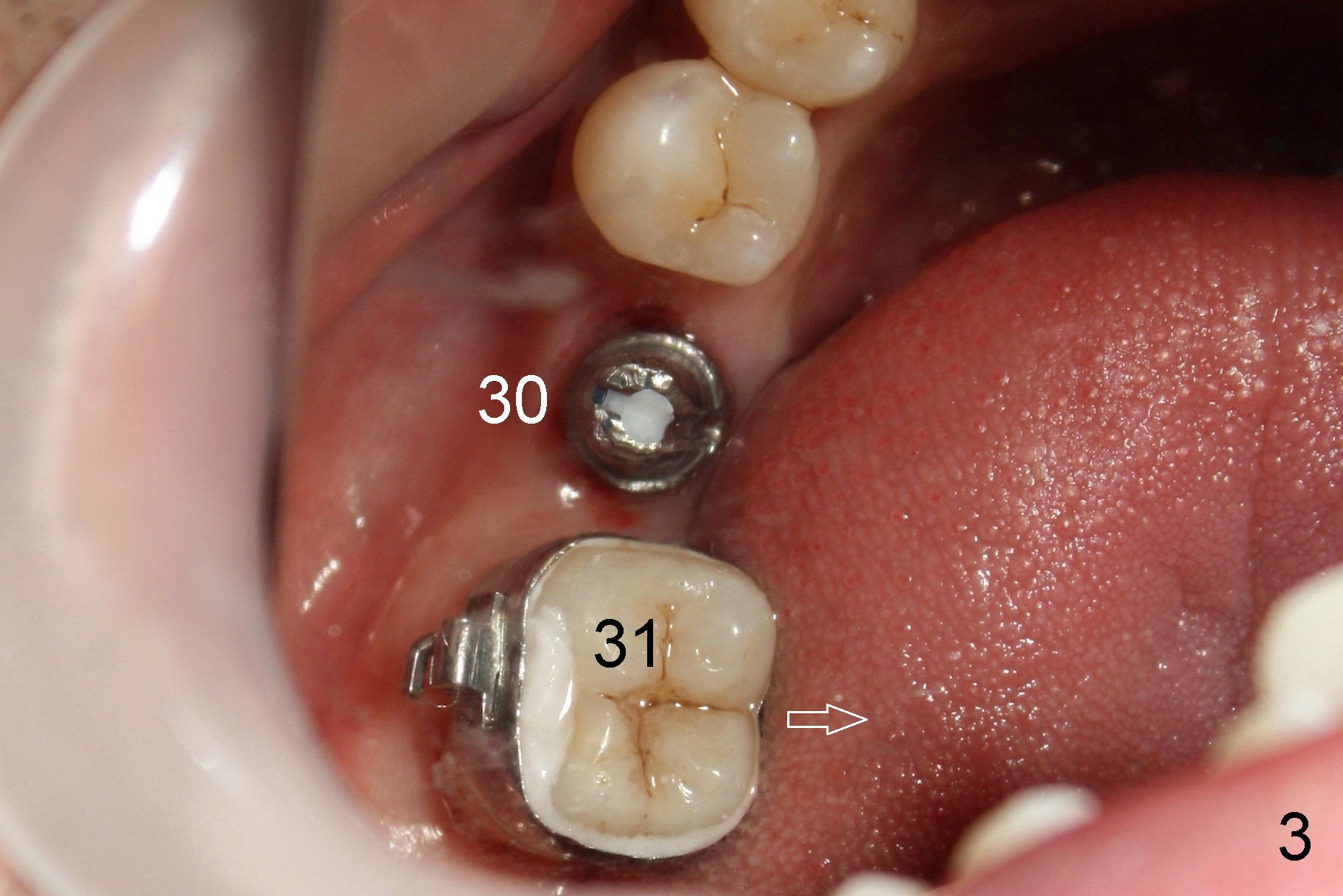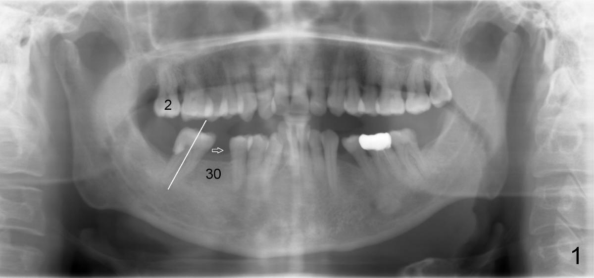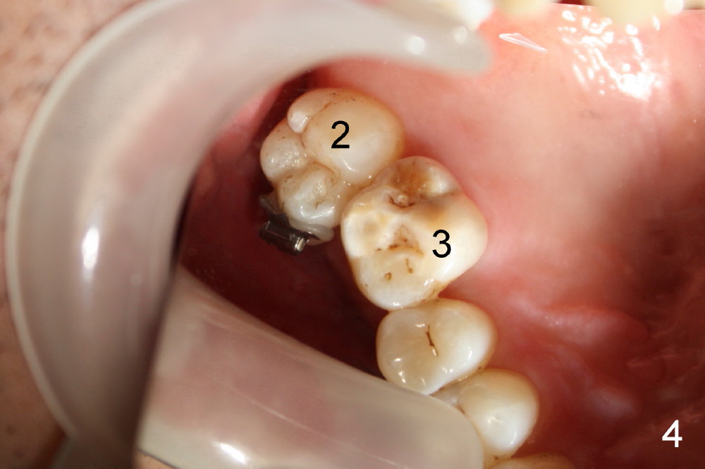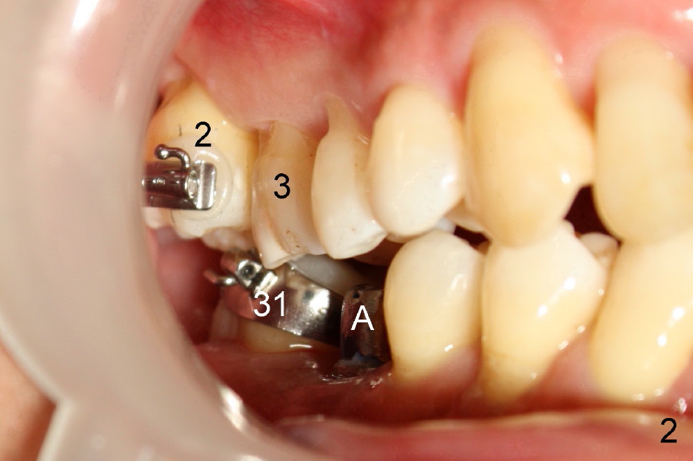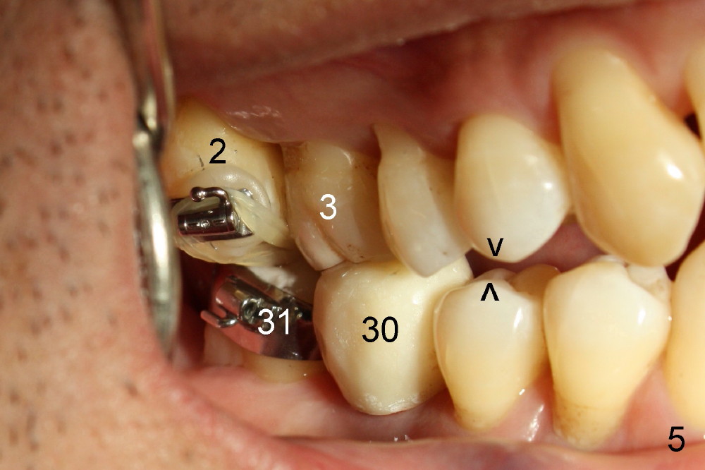 A 50-year-old man has lost the lower right 1st molar for several years (Fig.1: 30). The 2nd molar has shifted (arrow) and inclined (white line) mesially. It does not appear to occlude with the tooth #2 in this panoramic X-ray. It is planned to place an implant at the site of #30 and after osteointegration to use it as an anchorage to upright and distalize the tooth #31. Four and a half months after placement of a Tatum tapered implant (6x17 mm), a 5 mm 10 degree unipost ((short) abutment) is placed and prepared for temporary crown (Fig.2: A). Severe cross bite (overjet) is noted between the teeth #2 and 31. It is due to combination of the lingual inclination of the tooth #31 (Fig.3 (mirror view) arrow) and the buccal displacement of the tooth #2 (Fig.4 mirror image).