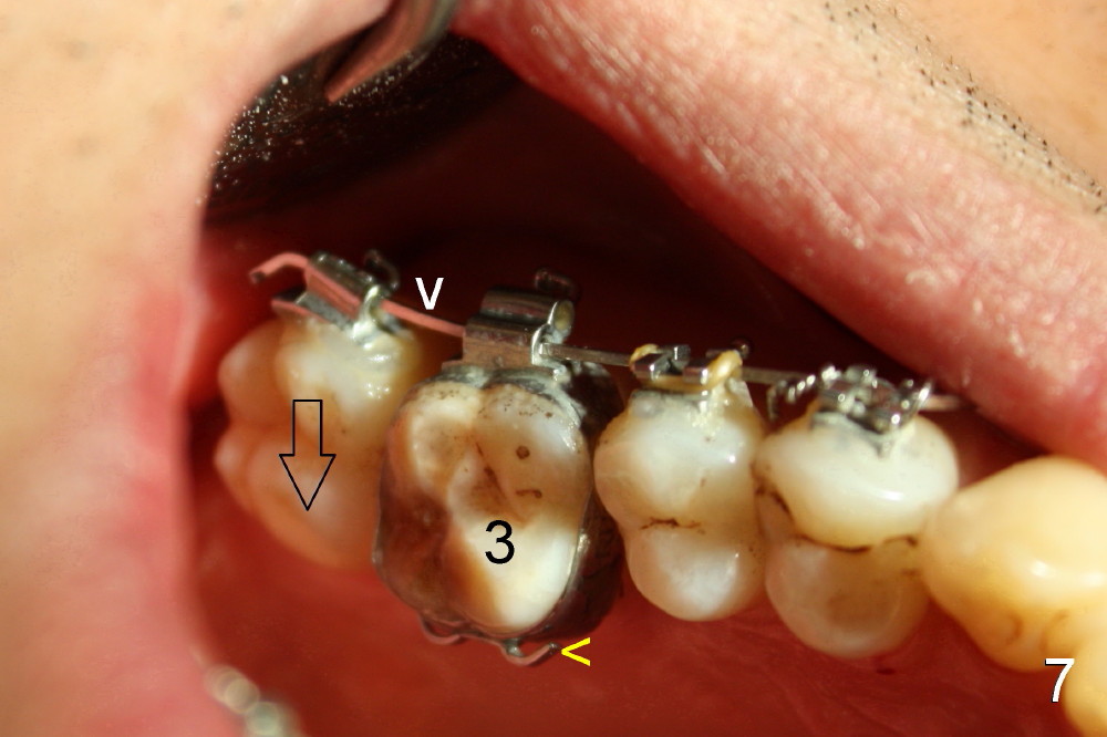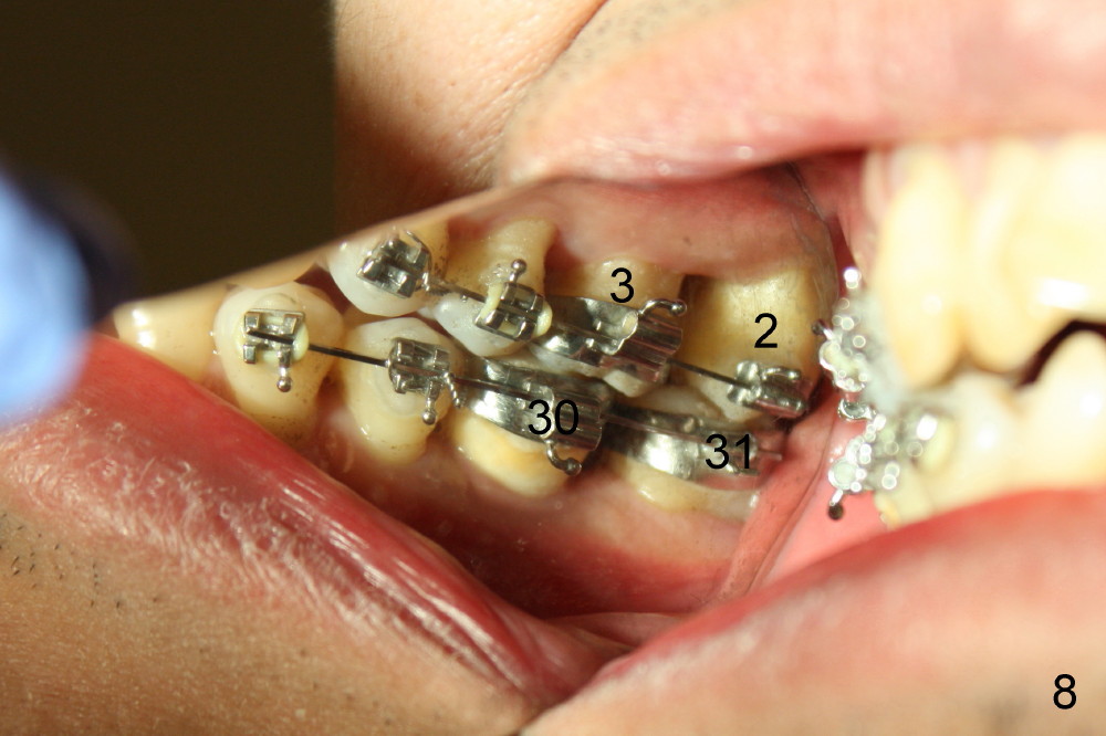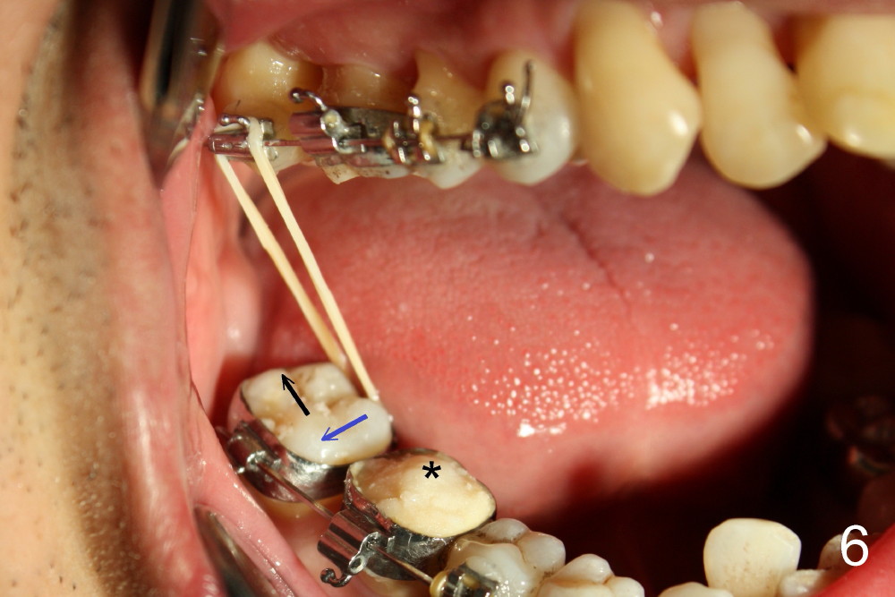 A molar band is placed for #31 and a bracket for #2 (Fig.5). A temporary crown (#30) is cemented with an intention to raise the occlusion. Notice the space between upper and lower premolars (between 2 arrowheads). There is also a space between #2 and 31. One to three elastic bands are placed between the buccal hook of #2 and the lingual cleat of #31 (Fig.5,6). One months passes without correction of the molar cross bite. More bands and brackets are placed in the upper and lower right posterior sextants (Fig.6). With combination action of elastics and segmental wires, the inclination of the tooth #31 is not only corrected buccolingually (blue arrow), but also mesiodistally (black arrow, uprighting). The implant crown is mainly used as an occlusal stop; because of constant wear, composite is being added (*) to its occlusal surface of the temporary crown to keep posterior occlusion open (let #2 and 31 move freely). In this case the implant is in fact not used as a pure anchorage to distalize #31 due to difficulty in placing an open coil spring between #30 and 31 tubes. The alignment of the upper right sextant improves under the tension (bending) of the wire (Fig.7 white arrowhead). The tooth #2 is being moved lingually. In fact, elastics are also placed between #3 lingual cleat (yellow arrowhead) and #30 buccal hook to improve #3 buccolingual position and/or inclination (compare Fig.4 and 7).