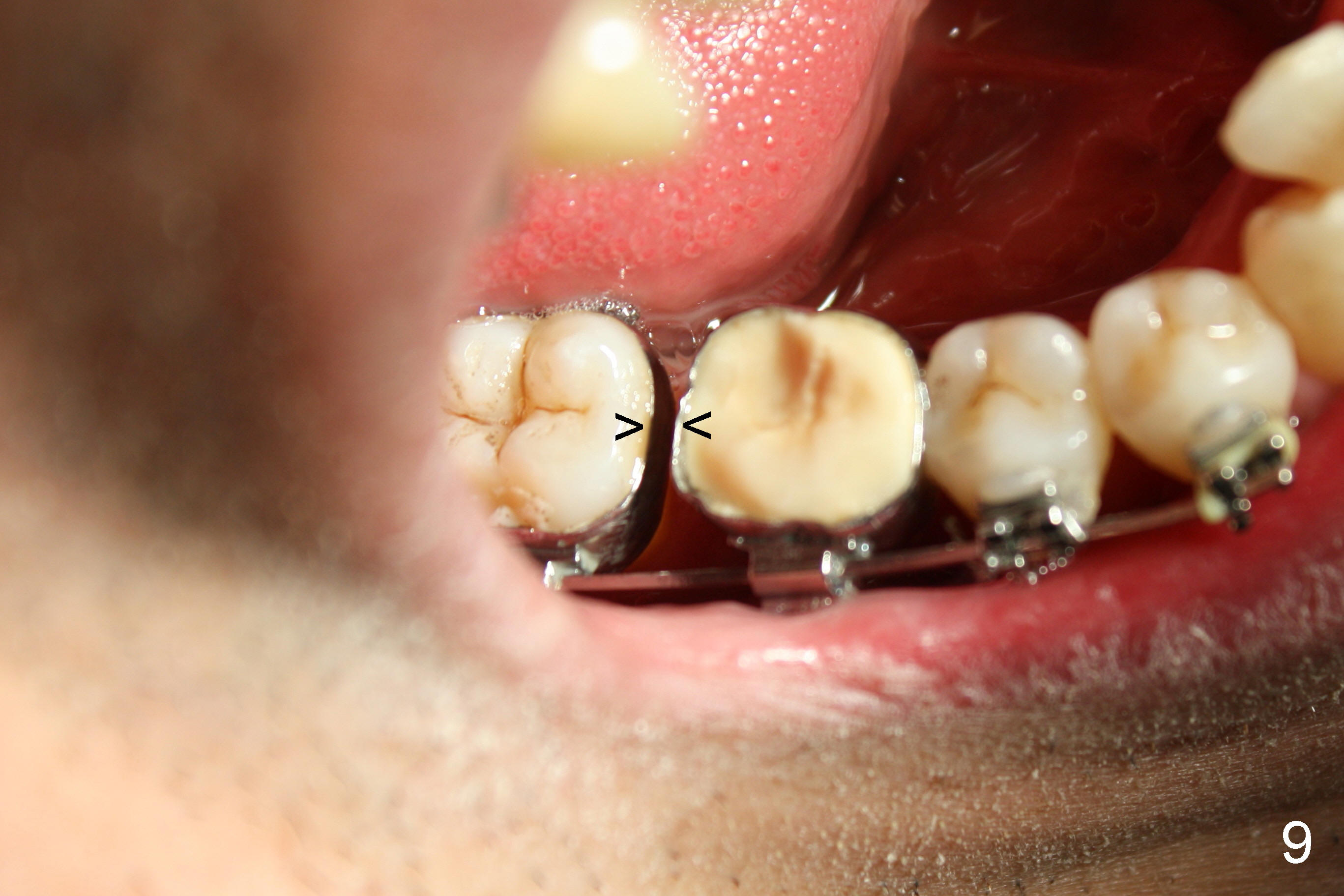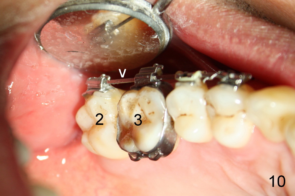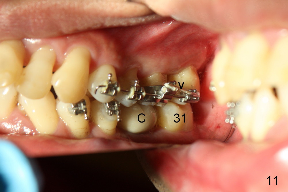 In 7 months, the right molar occlusion changes to Class I with normal overjet (Fig.8 mirror view). Class I posterior occlusion correction is evidenced by a gap between the teeth #30 and 31 (Fig.9 arrowheads) due to elastic retraction. There is no tension (bending) of wire between the teeth #2 and 3 in the final stage (Fig.10 arrowhead, as compared to Fig.7). A porcelain crown is subsequently cemented to the implant/abutment complex with occlusal equilibrium (Fig.11(mirror image) C). The remaining brackets and band are removed. Power chains in Fig.11 (arrowhead) were used to correct the rotation of the tooth #2 (Fig.10, bracket in the tooth was not well placed).