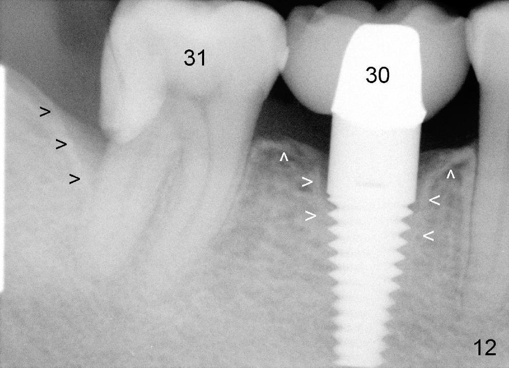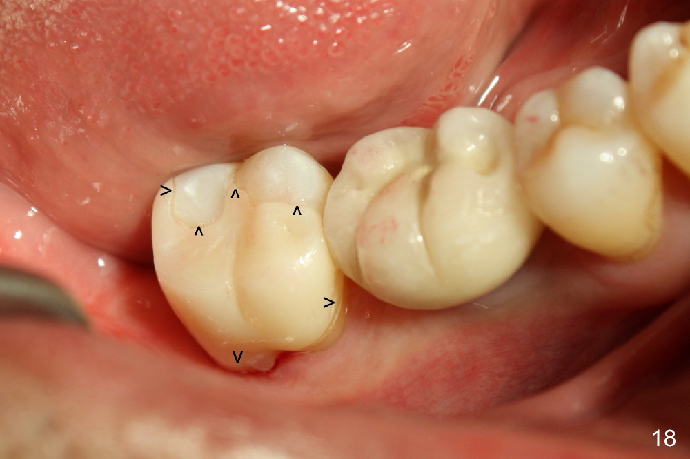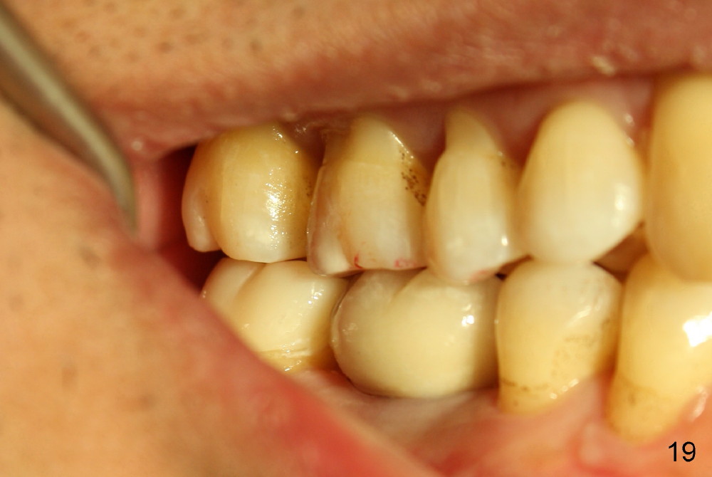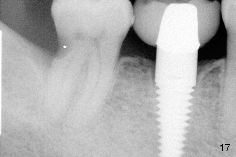 While the bone continues growing around the implant 1.5 years postop (Fig.17, as compared to Fig.12), the tooth #31 loses composite distally (*). A Zirconia onlay is cemented 1 year 10 months post implantation (Fig.18 arrowheads); the posterior interdigitation remains normal (Fig.19).