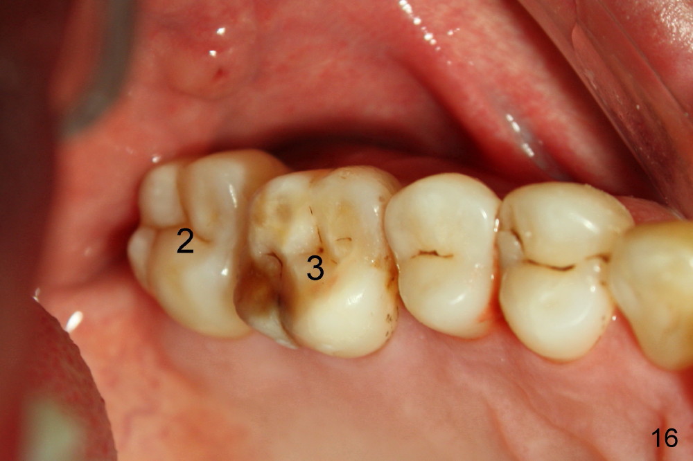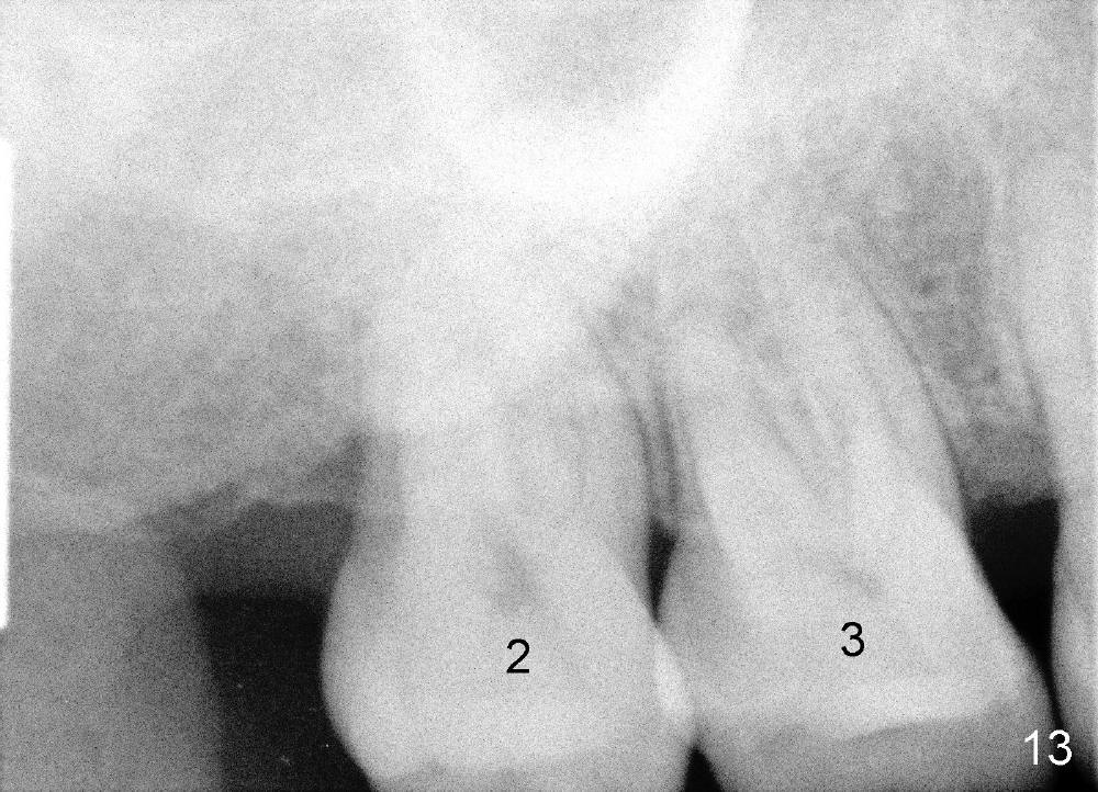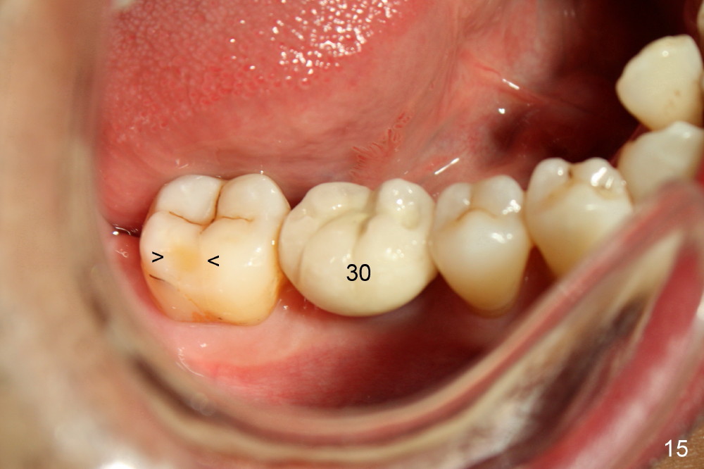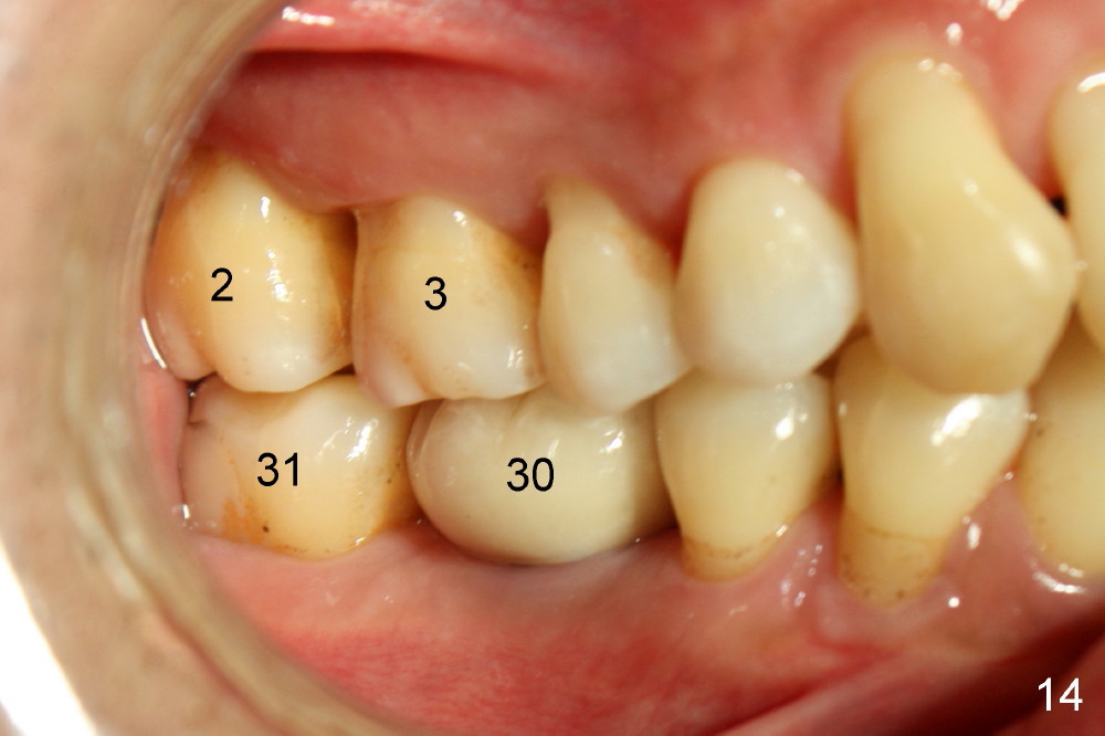 Fig.12-16 are taken 9 months after the orthodontic treatment. The lamina dura appears to form mesial and distal to the implant at the site of #30 (white arrowheads). There is no gross bone resorption associated with orthodontically moved teeth (Fig.12,13: #2,3,31). The posterior overjet remains normal (Fig.14). The arrowheads in Fig.15 indicate a worn facet, which was caused by the previous abnormal overjet (Fig.2). The alignment of the upper right quadrant also remains normal. The patient wears suction down retainers. He is pleased with improvement of mastication.