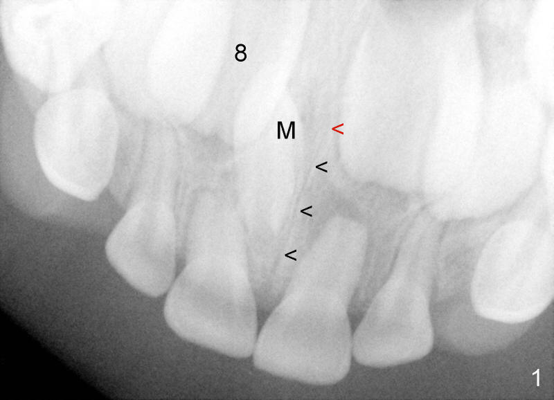 Crown of mesiodens (M) may be oriented toward apically (Fig.1), coronally (Fig.2) or palatally (Fig.4 axial section of CBCT). A common characteristic of mesiodens is that it does not cross midline suture (Fig.1,2 black arrowheads, Fig.4 white arrowheads), although it can push and deform midline suture (Fig.1,2,4 red arrowheads).