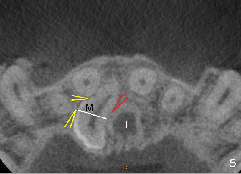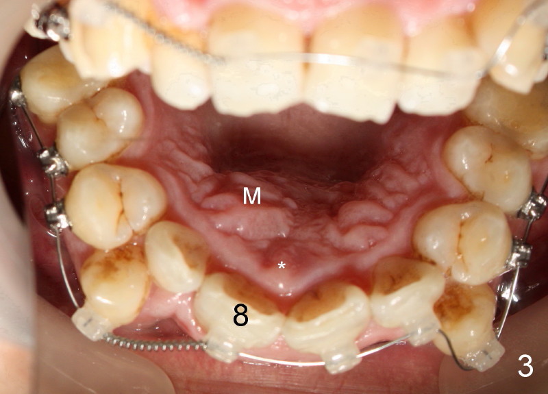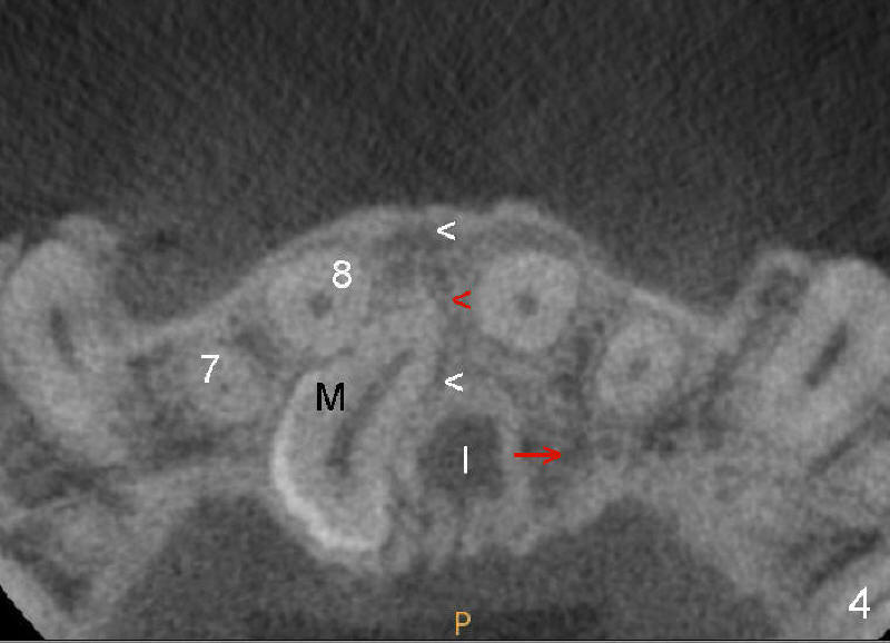 CBCT shows that the crown of the mesiodens is palatal (Fig.4: P). Second visual exam of the palate demonstrates an elevation (Fig.3: M) lateroposterior to the incisal papilla (*, a midline structure). It appears that CBCT is not so critical in deciding surgical approach for this case.