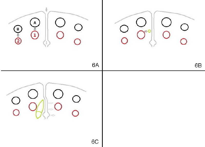 How does this happen? Here is a hypothesis. Fig.6A diagrammatically shows the developing premaxilla, which consists of the right and left portions, separated by the midline suture (solid arrow) and the incisal canal (I). As well-known, the developing deciduous incisor tooth buds (A, B) give rise palatally to permanent tooth buds (1,2), respectively (open arrows). For unknown reasons, the developing permanent central incisor tooth bud produces medially an extra tooth bud (mesiodens, green circle in Fig. 6B). The cortices of the developing midline suture appears to be a barrier for the developing mesiodens. Unlike deciduous or permanent teeth, the development mesiodens apparently does not have its definitive growth pattern (probably due to its absence of deciduous precursor). It may grow upward (Fig.1), downward (Fig.2) or palatally (Fig.4,6C) along suture cortex.