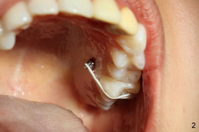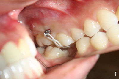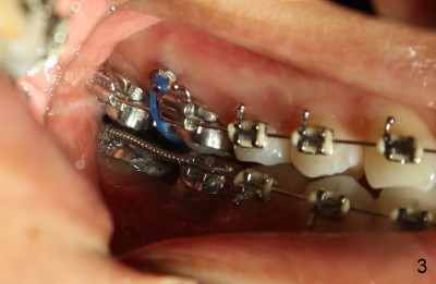 Two mini-implants were placed for #14 intrusion (Fig.1 (mirror image),2): buccal between #14 and 15 and palatal between 13 and 14. Brackets and bands were placed 14 days later.