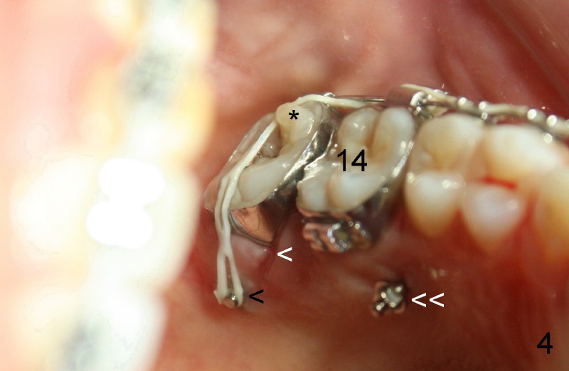 Seven months later, the intrusion of tooth #14 appears to be achieved (Fig.3 mirror image). Seventeen months after mini-implant placement, the tooth #15 is relatively supraerupted as compared to #14 (Fig.4 mirror image). To tackle the new issue, a new mini is placed distopalatal to #15 (black <). Composite build up is placed (*) to hold power chain in place to avoid soft tissue damage (white <). The mini mesiopalatal to #14 (double white <<) is used to extrude #18. Return the main text