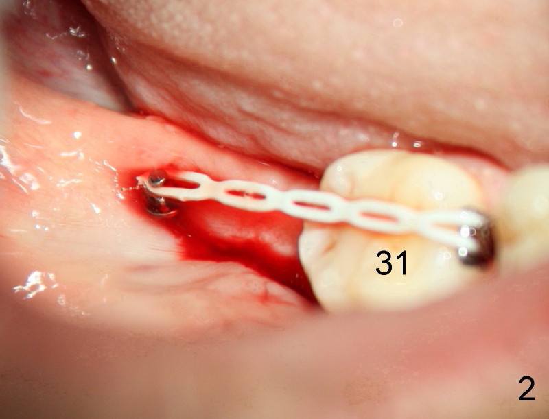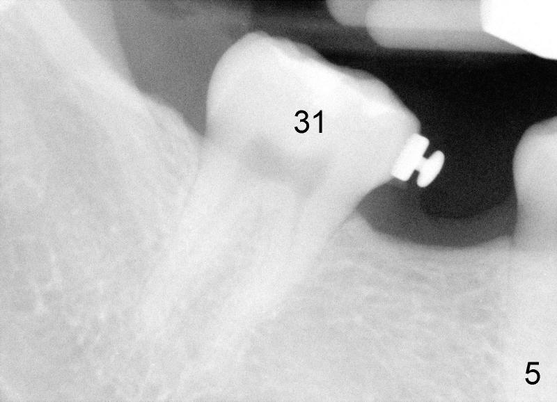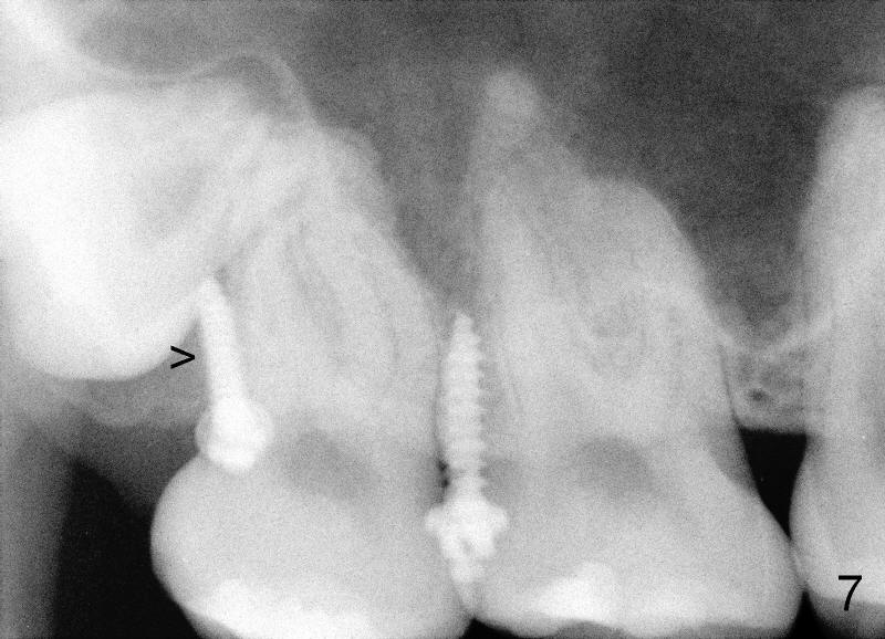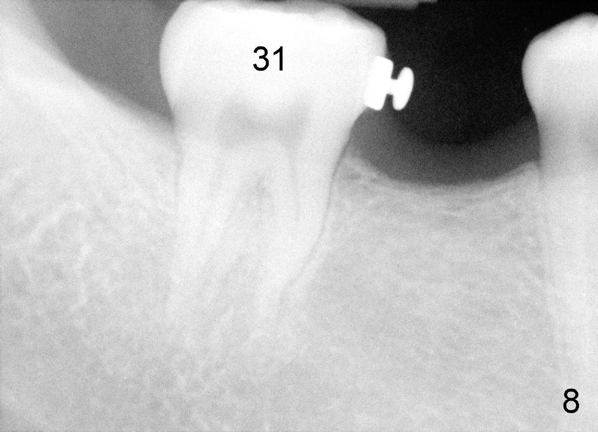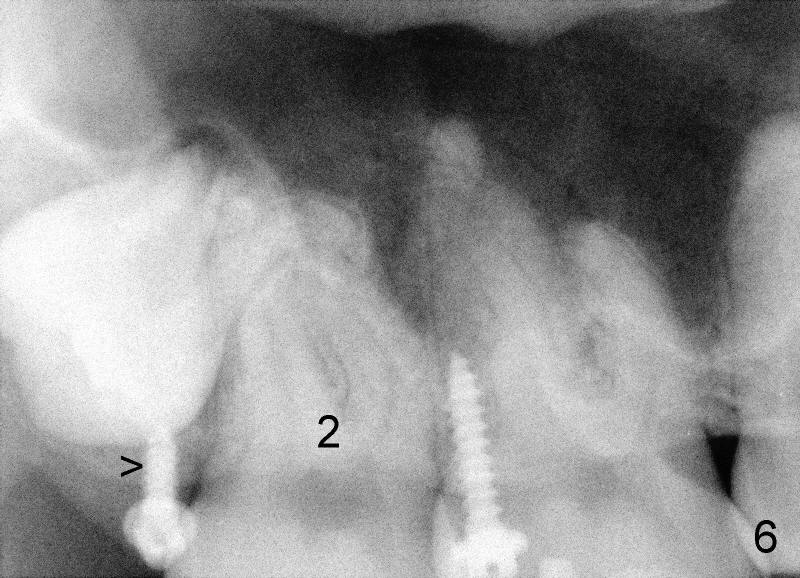 Mini penetration does create soft tissue shaving, which may cause epithelial entrapment and therefore potential mini loosening. At time of placement, it is a minor issue, in comparison to violation of root surface. As the mini goes down, torque builds up. Finally the handpiece halts. Then use a wrench to slowly rotate the mini down while watching for patient's reaction. It appears that the mini eventually has resistance (touching root surface?). The mini does not seat completely (Fig.4 >, as compared to Fig.3 <), but it is solid. When power chain is loaded, it is apparent that the patient feels more pressure upon #2. The patient tolerates the procedure with topical well. It feels like that champagne is needed for celebration. Sweeter is taking and looking at immediately post-op PA (Fig.7 >).