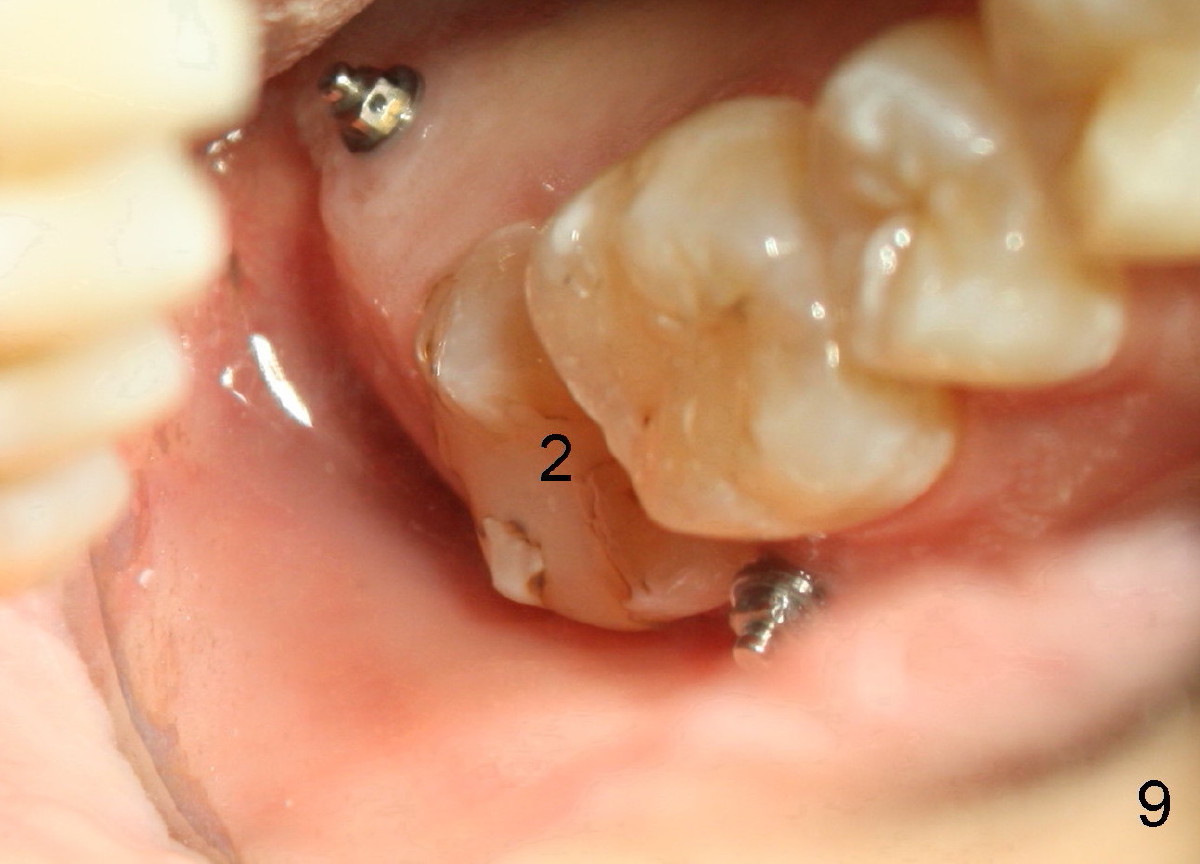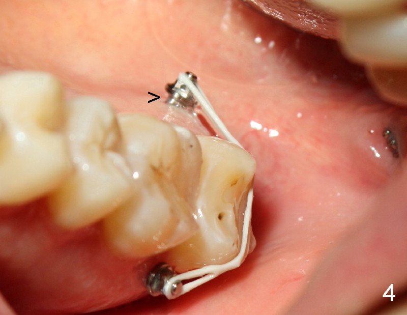 Eight mm of Ancor mini-implant is placed on the mesiobuccal of #2, whereas 6 mm on distopalatal (Fig.3,6 <) without sign of hemorrhage. But a few days later, the patient's father calls, saying that one of mini is out (palatal). The palatal mucoperiosteum is thicker than buccal. Longer mini-implant should have been used (8 or 10 mm). The excuse for short mini in the palate is that there is not much soft tissue (presumably hard tissue) distal to #2. In fact, the patient is dental phobic. Who will faint first dealing with the fearful patient for the same procedure for a second time?