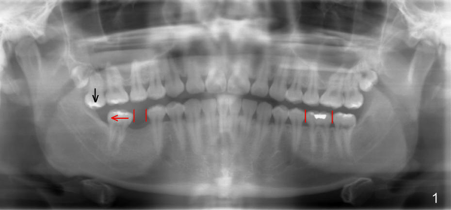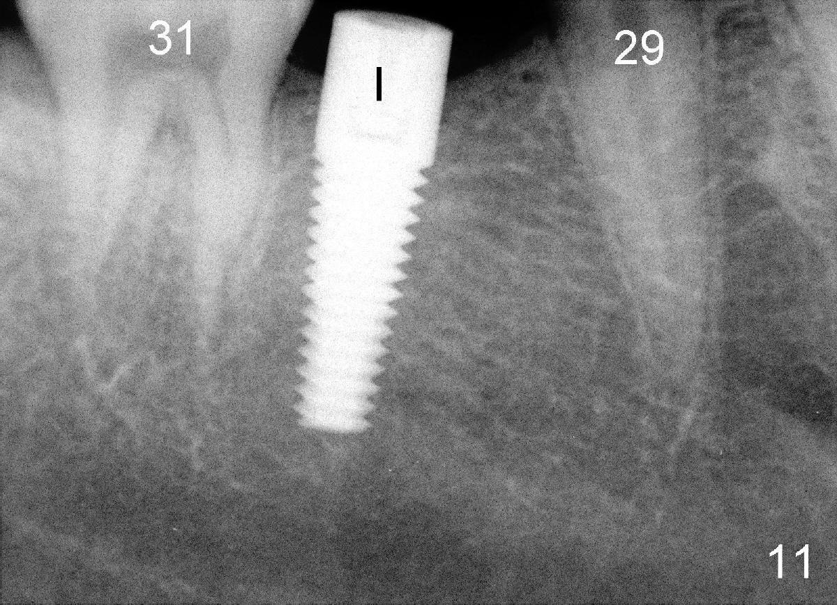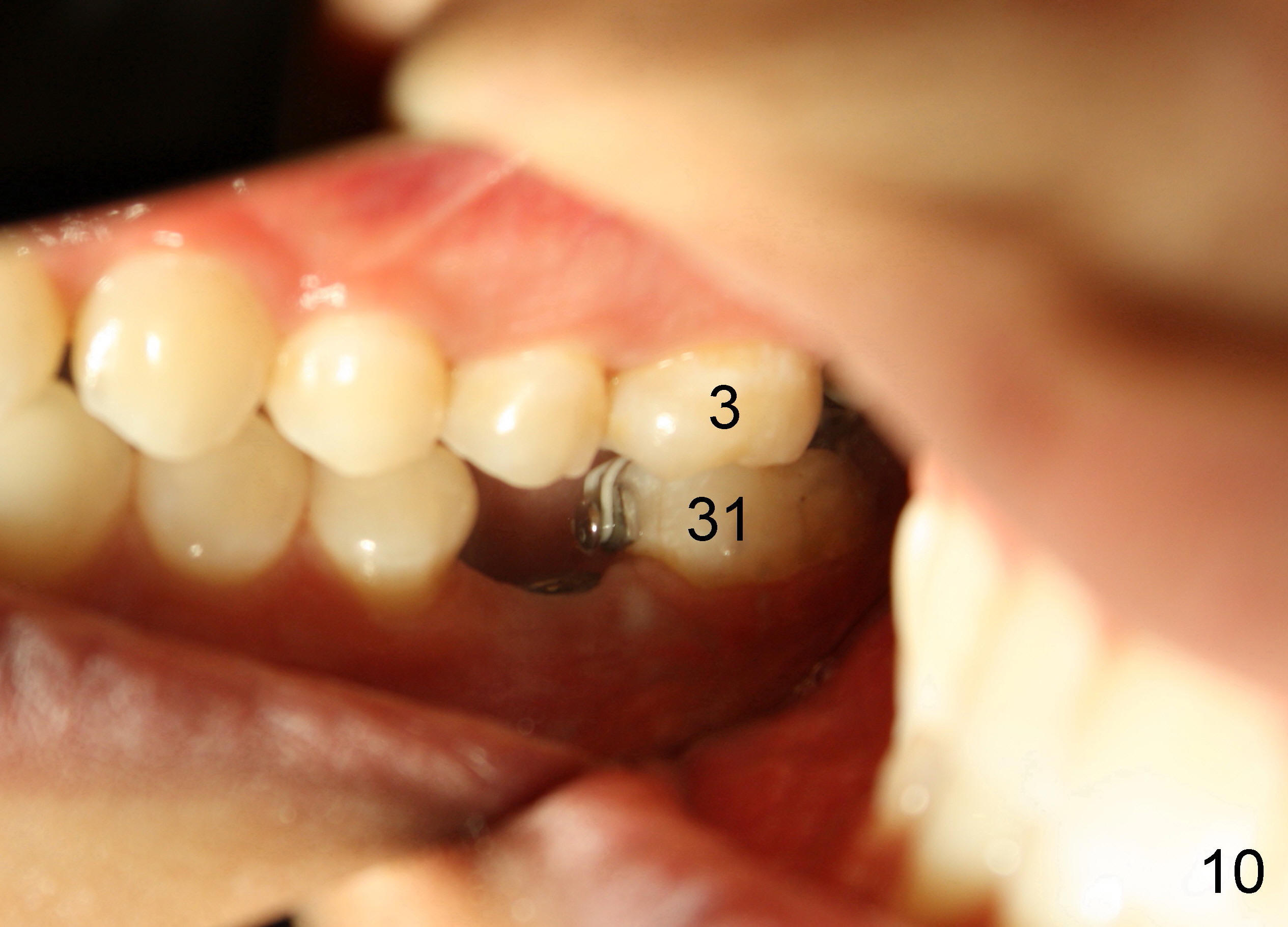 The tooth #31 is uprighted in six months (Fig.8, as compared to Fig.5). The edentulous space increases from 6 mm to 9 mm mesiodistally, which is still not enough. The M-D width of #19 is 12 mm. In fact, the tooth #2 has been intruded substantially (Fig.9. Compare to Fig.3). The possible reason for resistance of distal movement of #31 is an interference from the tooth #3 (Fig.10). A regular implant is placed intentionally in the distal aspect of the edentulous area (Fig.11: I). The next plan is to place temporary crown on the implant once it osteointegrates to raise the occlusion efficiently so that the tooth #31 is free to move distally with retraction of power chain attached to the mini-implant (as shown in Fig.2). The regular implant may be also used as anchorage to push #31 distally. See you later.
