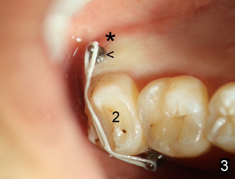 Fortunately, the kid is getting more mature each time. He is pleased to hear that no needle is needed. Another mini company (Tomas, Dentaurums) recommends topical and no incision for mini. Without local anesthesia, the patient may feel pain if a long mini is touching root surface. To get decent anesthesia, Cetacaine (a topical usually used for laser) is applied to the mucosa for prolonged period of time. A 10 mm Ancor mini is loaded in a 16:1 reduction slow-speed handpiece driven by air turbine. The mini penetrates the mucosa without incision or pilot drill. Judged by healed wound, the new mini is placed more mesioapical than the earlier one (Fig.3 *) in hope to catch bone. It appears that the whole hard palate has attached gingiva. The portion near the teeth has thicker gingiva. Mini should be placed in thick gingiva to reduce tissue reaction.
