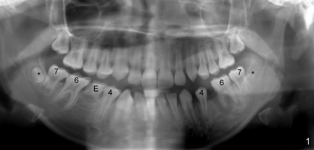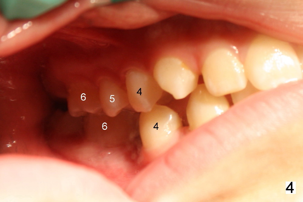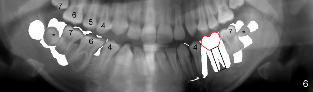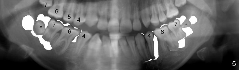 If RCT is successful for the lower left 1st molar, the lower right E is to be extracted. All of the lower molars (including the third molars (Fig.5 *) will be moved mesially so that the final molar occlusion is Class III bilaterally. This is Plan A.