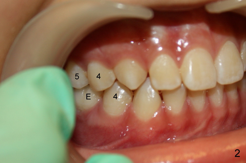 Two lower 2nd bicuspids are congenitally missing in a 11-year-old boy (Fig.1). The lower left (LL) E has been extracted due to caries. There is severe periapical radiolucency associated with the LL6. Root canal therapy (RCT) is being carried out for this molar with difficulty. In addition, the boy is a dental phobic, refusing to have the lower right E extracted in spite of DO caries and pain. In order to reduce the chance of future surgery, including extraction, there are two orthodontic plans to move the lower molars mesially. Fig.2-4 show that the anterior occlusion and right posterior interdigitation is nearly within normal limit, whereas the left is not.