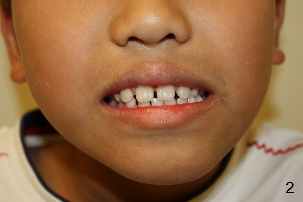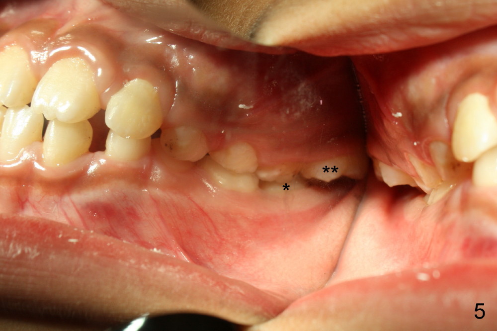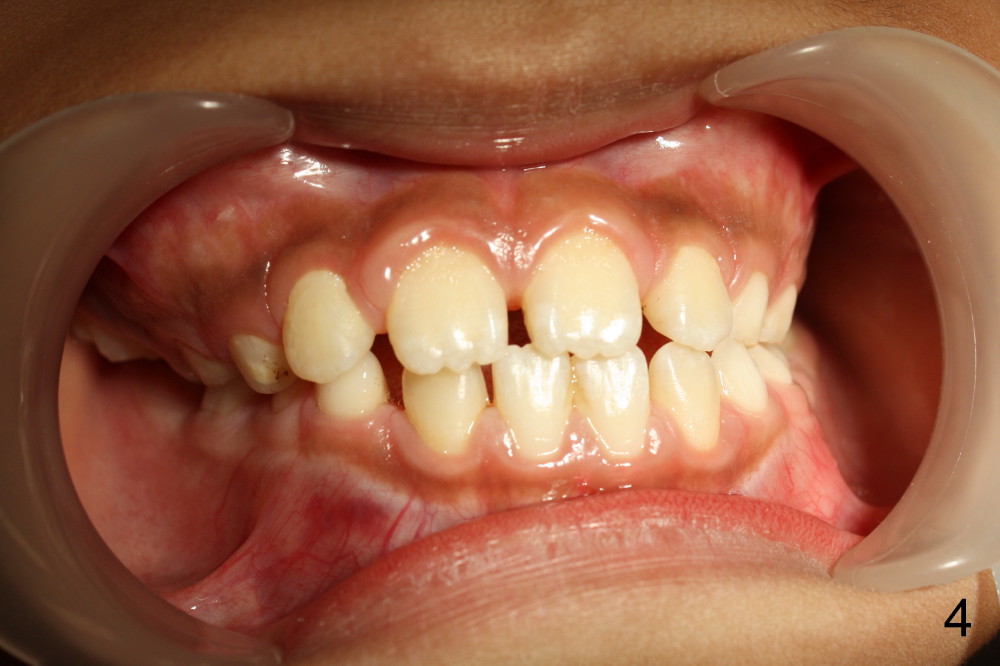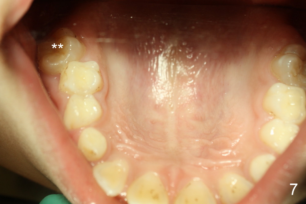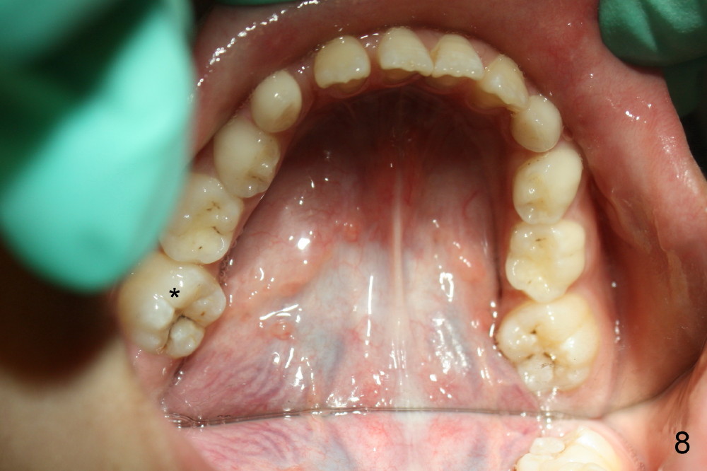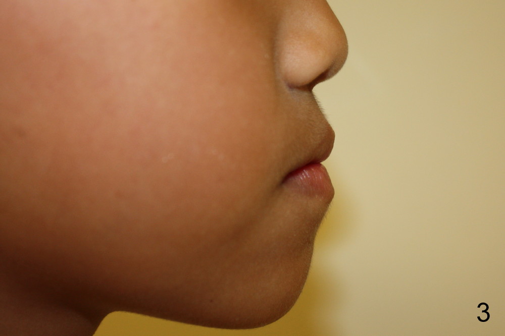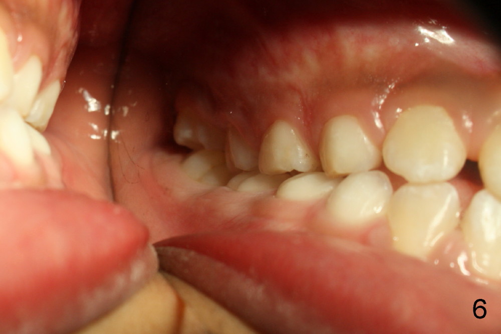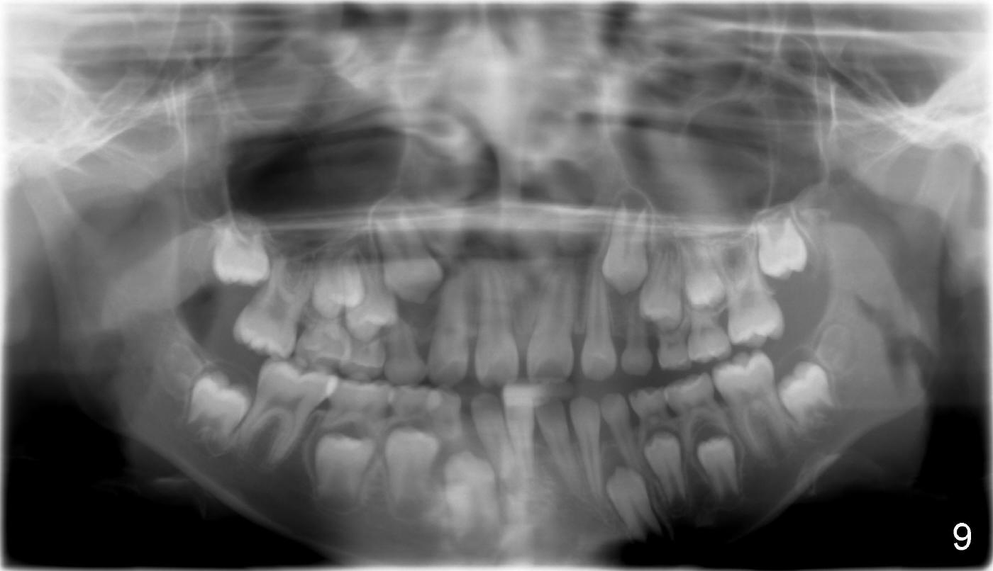 It appears that the chin deviates to the left (Fig.1). The lower dental midline also deviates (Fig.2,4). Profile shows possible bimaxillary protrusion (Fig.3). There is cross bite (deep overjet?) on the right side of the first permanent molars (Fig.5 mirror image), whereas the left posteriors apparently present edge-to-edge occlusion (Fig.6). Fig.7,8 are mirror views of the upper and lower arches, respectively. Panoramic X-ray demonstrates elongation of the right condyle (Fig.9). The right ramus appears to be longer than the left.