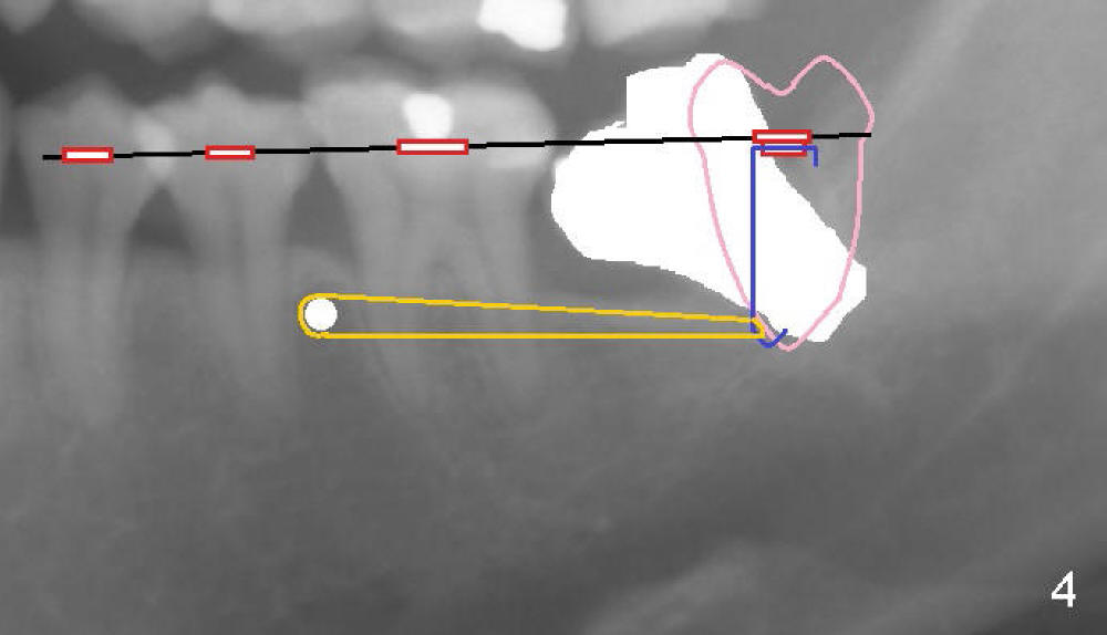 Fig.4. After uprighting #18 (pink outline), place single-tube brackets/band on #19-21, a double-tube bracket/band on #18 and regional arch wire through #18-21 brackets/bands (black line). A rigid rectangular wire (blue) is inserted into the lower tube of #18. The lower end of this wire is at the same level of the mini-implant. Under tension using a closed coil spring or power chain (yellow), the tooth should undergo body movement mesially. Return to main article