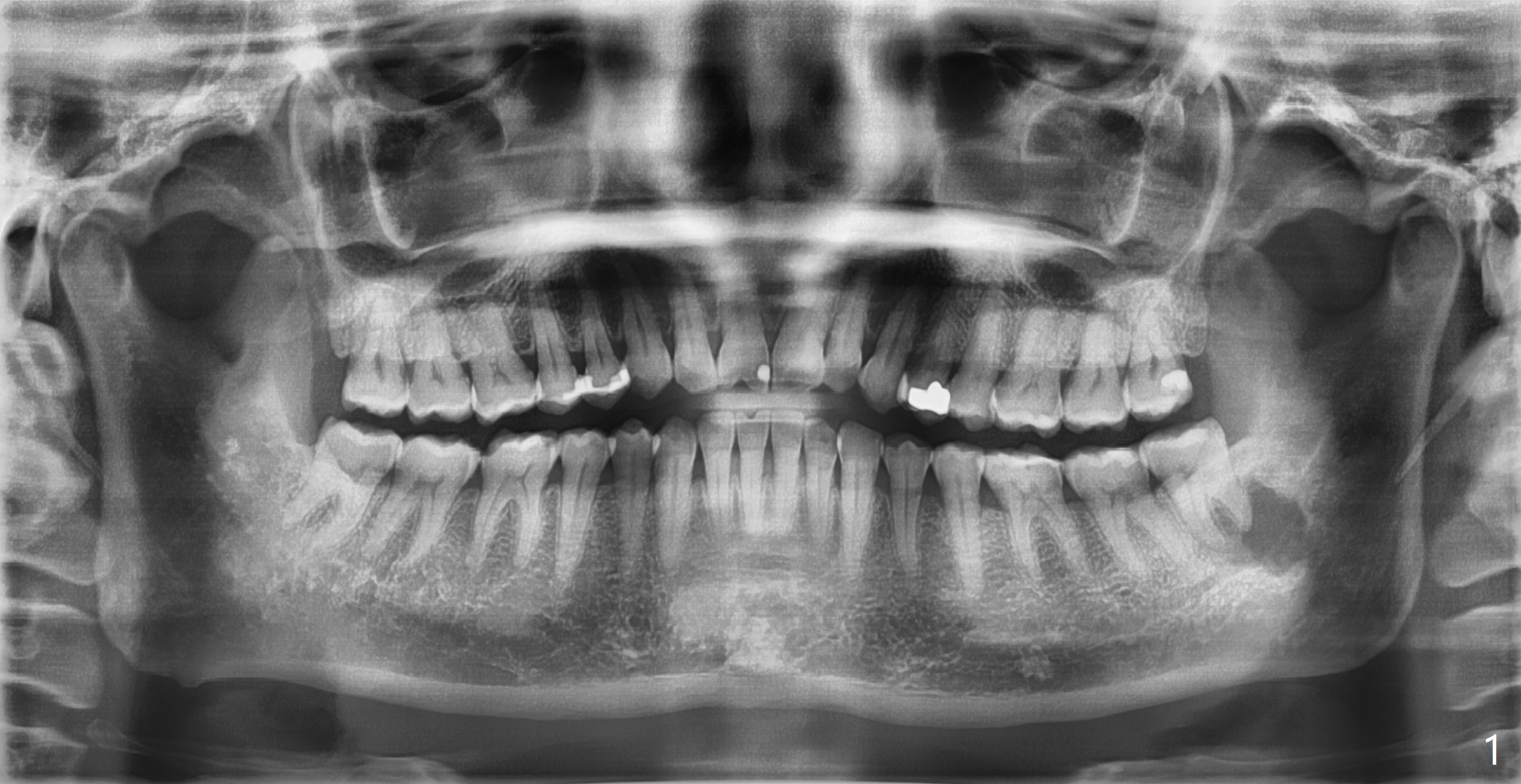 51岁女,无症状,可能夜间磨牙,全景片无意发现左下8远中囊肿(图一),牙髓活力测定:活髓,颊侧舌侧无肿胀,牙周袋正常。五年前全景片(图像不清晰)显示病变小。鉴别诊断?她不愿意自费拍摄CT,想用医疗保险诊治,所以转给口外医生。