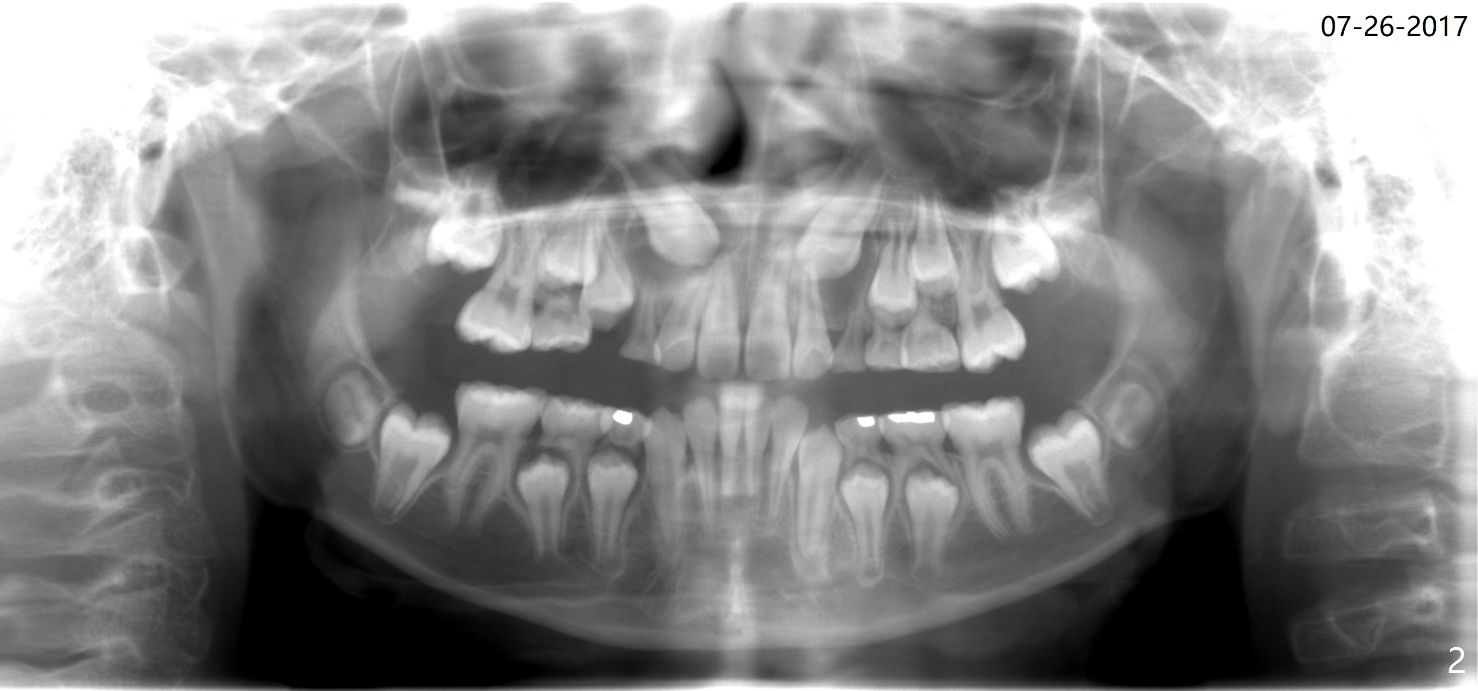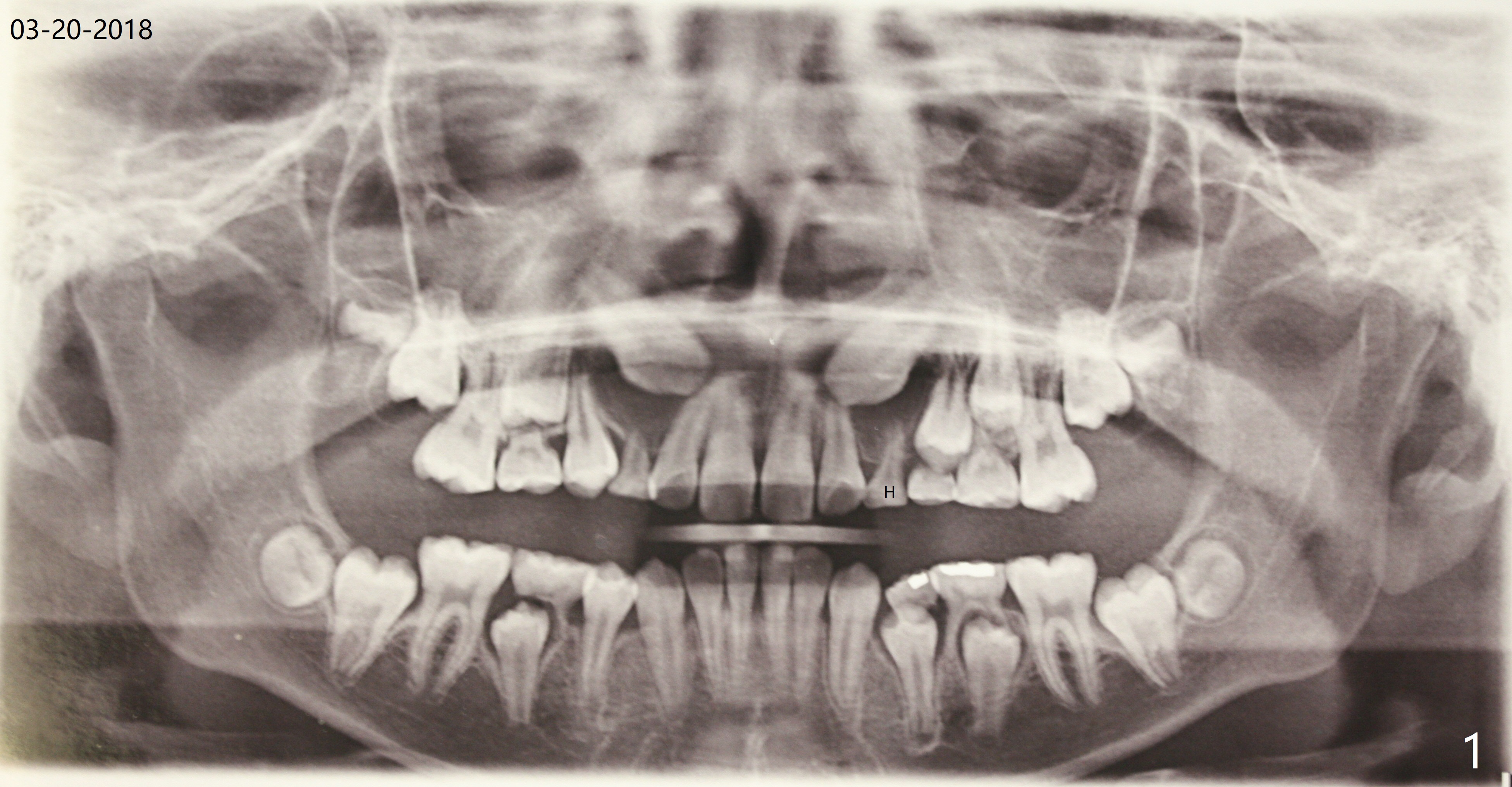 A 13-year-old boy with Class III malocclusion returns with mother from an orthodontic office for extraction of the tooth H with panoramic X-ray taken last year (Fig.1). An interesting finding was present, but not diagnosed a year earlier (Fig.2).