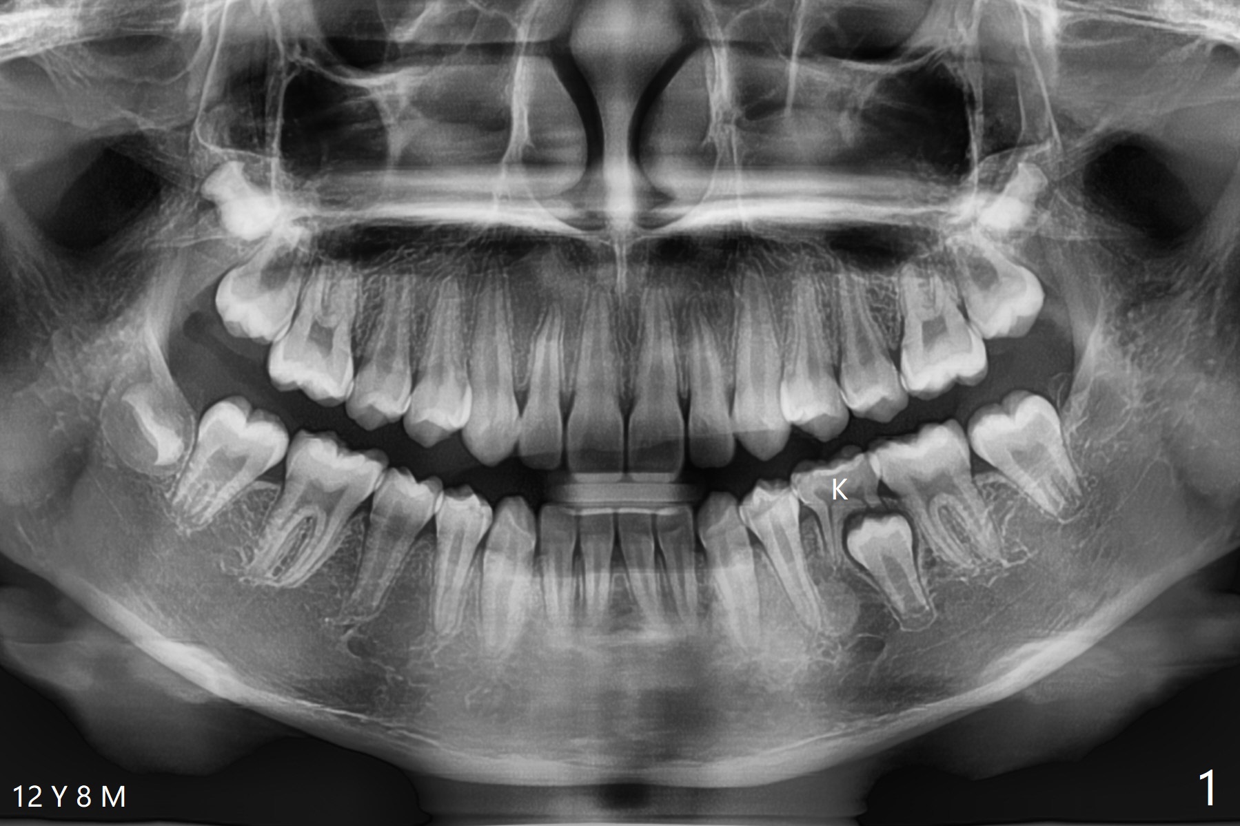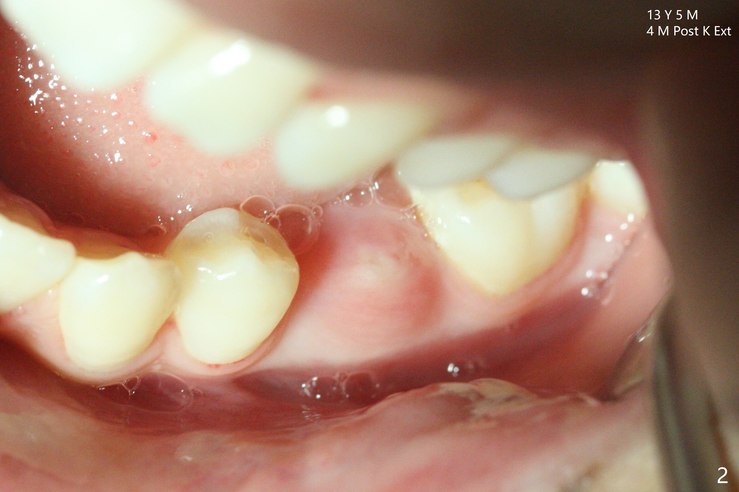 A 12-year-8-month-old woman retains K (Fig.1). Four months post extraction of K, the underlying permanent tooth is going to erupt (Fig.2).