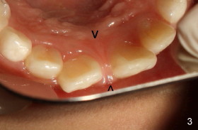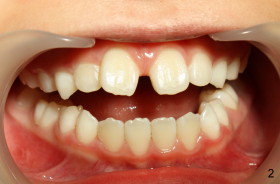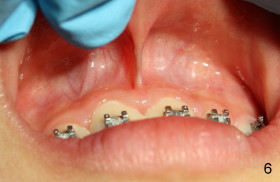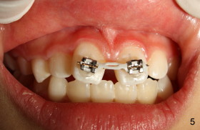 Eight-year-two-month girl has diastema between the maxillary central incisors. It appears that the upper labial frenum (Fig.3 arrowheads, mirror view) bisects the interdental papilla (Fig.5). Frenectomy is planned before orthodontic closure of the diastema. Fig.4 is pre-op X-ray. Five months later, the diastema is closed. The frenum appears to recede upward (Fig.6). The bisected papilla seems to fuse (Fig.6,7). Although the diastema has tendency to relapse when power chains are not used, fixed lingual retainer is planned to prevent the relapse when brackets are to be removed. It appears that frenectomy is not so highly necessary for this purpose.