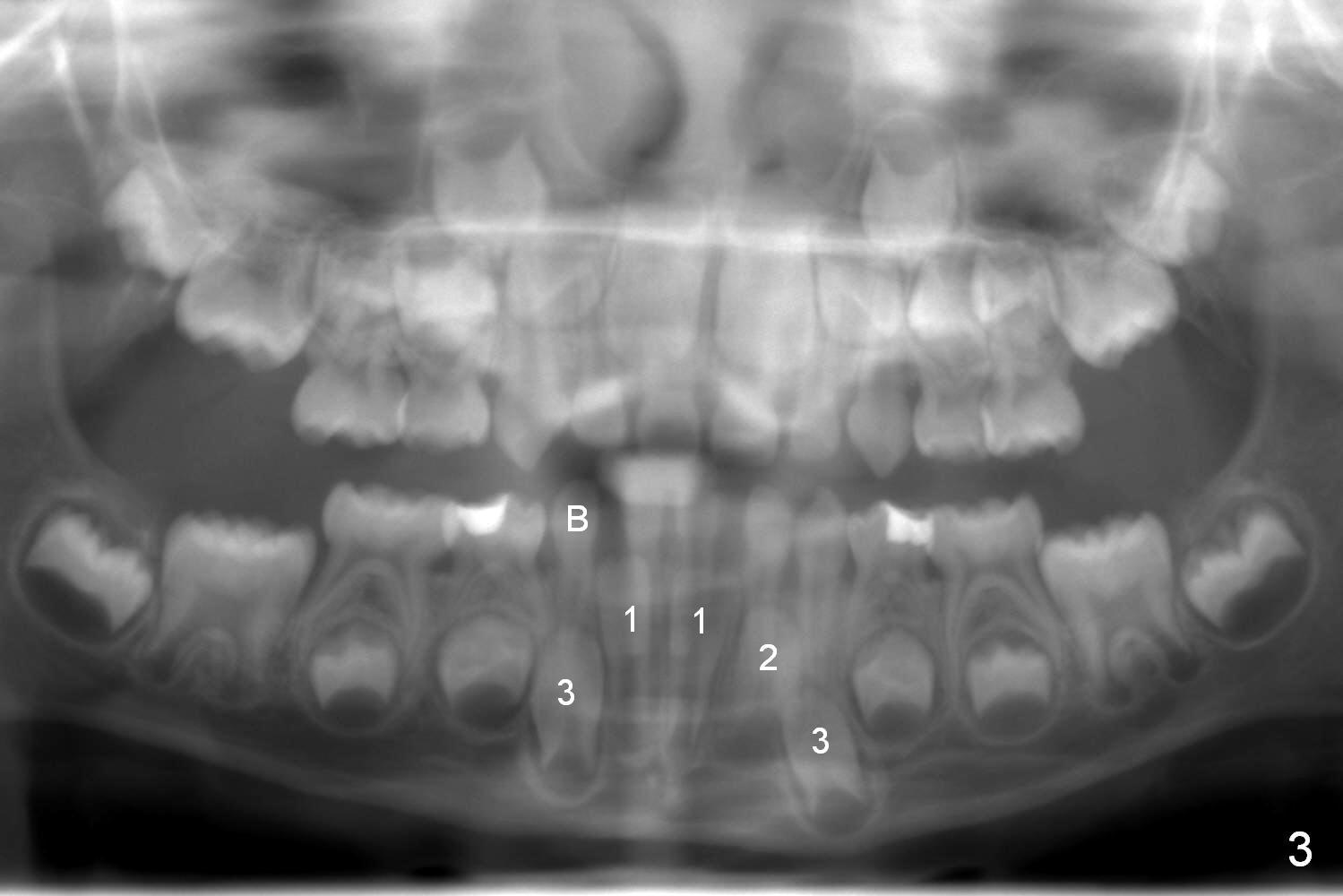 As is known, the deciduous tooth buds give rise to the underlying permanent ones (Fig.4 (illustration for the anterior teeth). Where LR C is missing, most likely the permanent canine (LR 3) is missing (Fig.5,6), whether B is shifted or not.