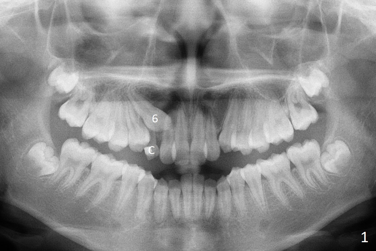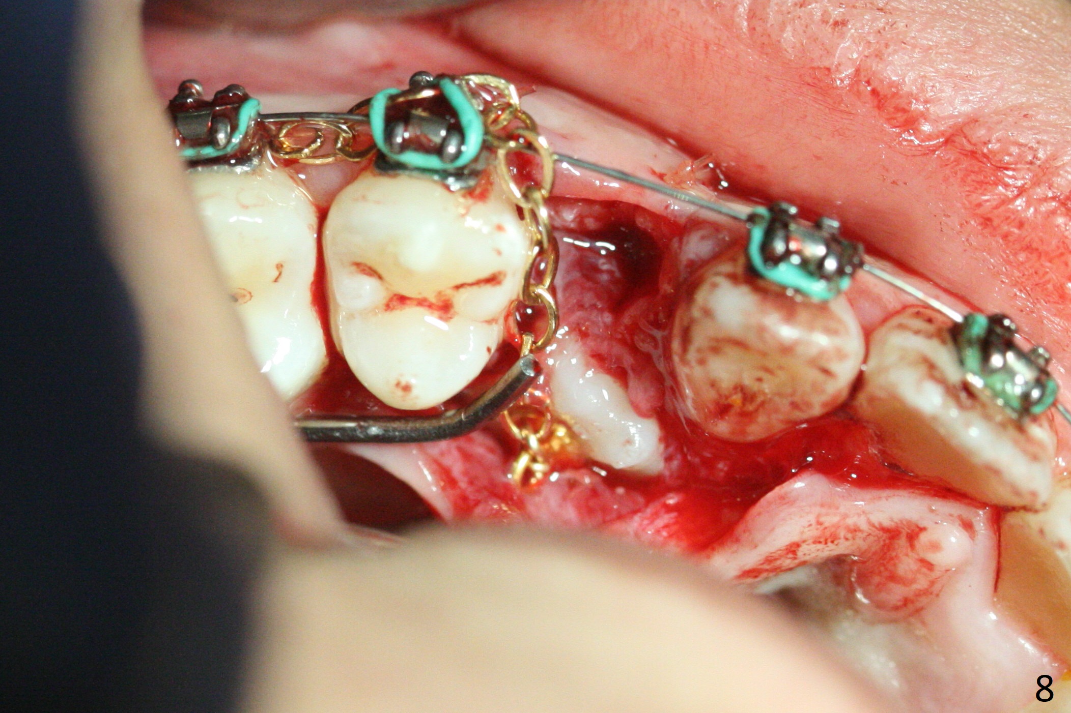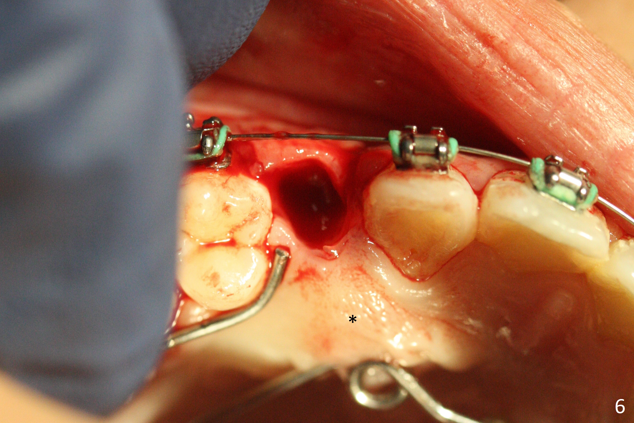 A 13-year-old woman has an impacted canine (Fig.1 (6)) and retained deciduous one (C). After initiation of orthodontics, she returns for surgical access to the impacted canine and placement of device to facilitate eruption (Fig.2,3). Incision is made buccal (Fig.4), but there is no tooth buccal (Fig.5). Extraction of the deciduous canine does not reveal the impacted one (Fig.6), but there is palatal elevation (*). Palatal access shows the impacted tooth (Fig.7) and allows placement of a retraction device (Fig.8). Careful clinical exam and CBCT are necessary diagnostic steps.